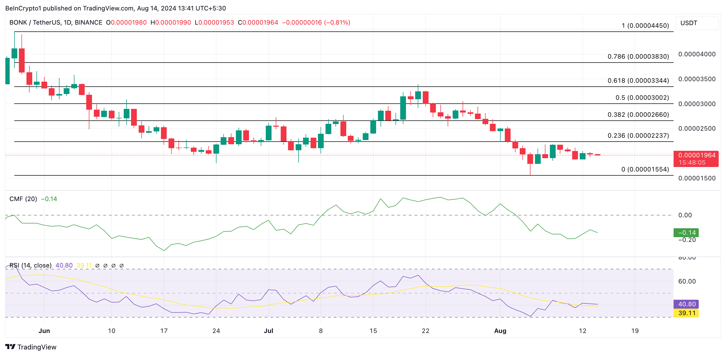 على سبيل المثال، يظل مؤشر القوة النسبية (RSI) لـعملة بونك BONK أدنى من خطه المحايد عند 40,80. يقيس هذا المؤشر ظروف السوق المشتراة والمباعة بشكل زائد. في قيمته الحالية، يشير RSI لعملة بونك BONK إلى أن ضغط الشراء منخفض مقارنة بنشاط البيع.