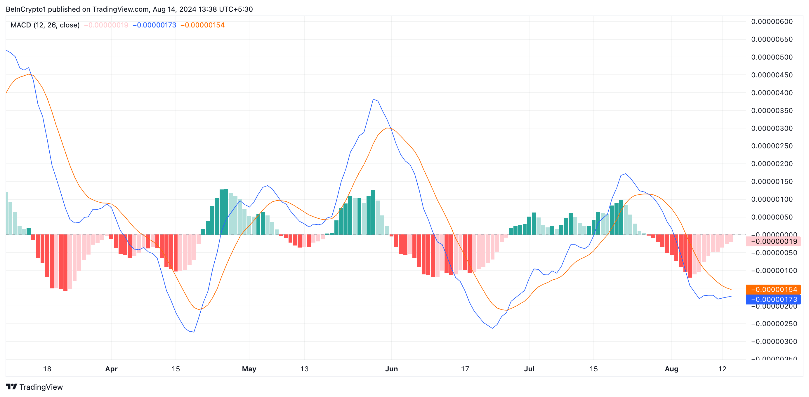 يبرز مؤشر التقارب/التباعد للمتوسطات المتحركة (MACD) لـ BONK الانحياز الصاعد المتزايد نحو العملة البديلة. في وقت النشر، يُرى خط MACD للرمز (الأزرق) وهو يحاول عبور خط الإشارة (البرتقالي) بشكل صاعد.