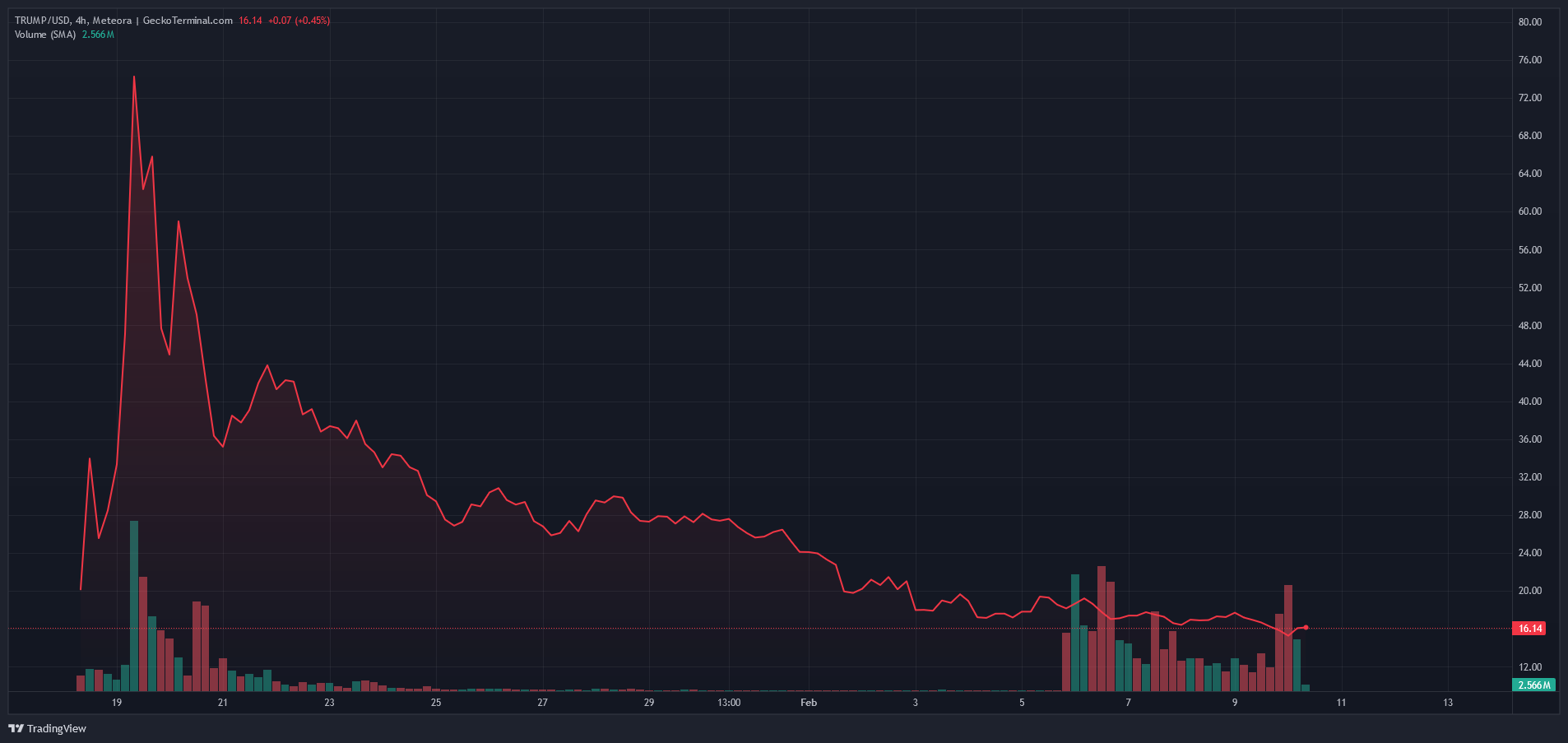 استمر سعر عملة الميم ترامب الرسمية $TRUMP في التراجع و الانهيار ليبلغ في الساعات الماضية أدنى مستوى قياسي جديد عند 15 ولار، بعد أن لامس عند إطلاقها 75 دولار حسب بيانات CoinGecko.
