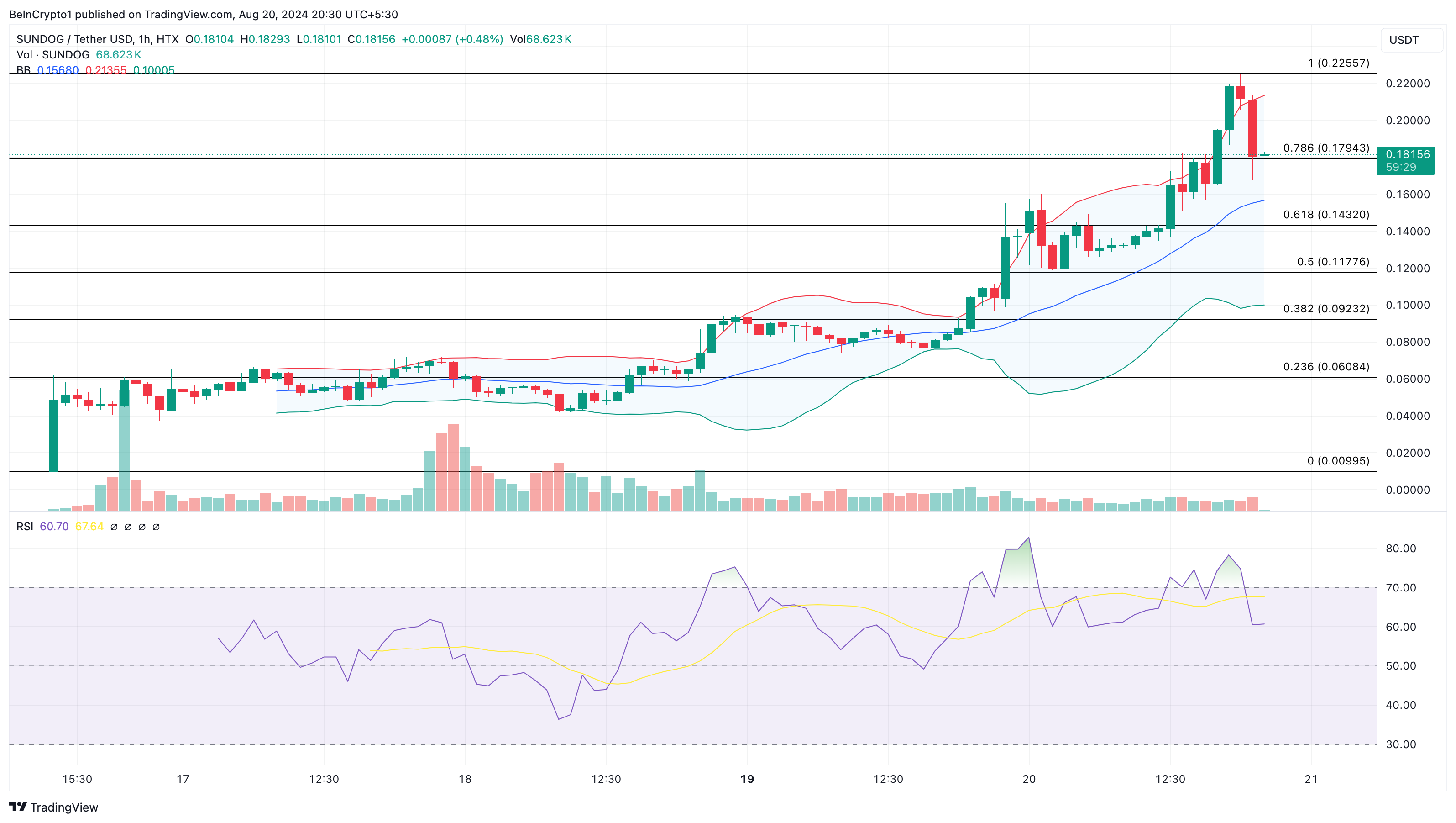 يوضح الرسم البياني للساعة أدناه أن سعر SUNDOG قد تراجع من ذروته عند 0.22 دولار. يمكن أن يعزى هذا الانخفاض إلى الإشارة إلى أن عملة الميم على ترون كانت في منطقة ذروة الشراء.