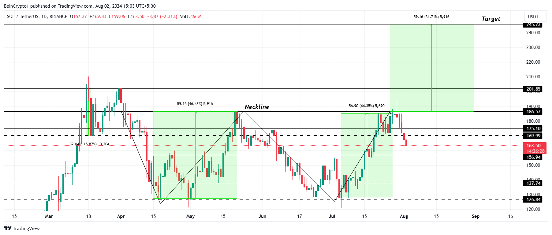 أدى الانخفاض إلى فشل نمط القاع المزدوج الصاعد تقريبًا، وسيتم تأكيد الفشل إذا انخفض سعر سولانا إلى أقل من 156 دولارًا. يتنبأ هذا النمط بارتفاع بنسبة 31% لـ SOL، مما سيدفعها إلى السعر المستهدف البالغ 245 دولارًا.