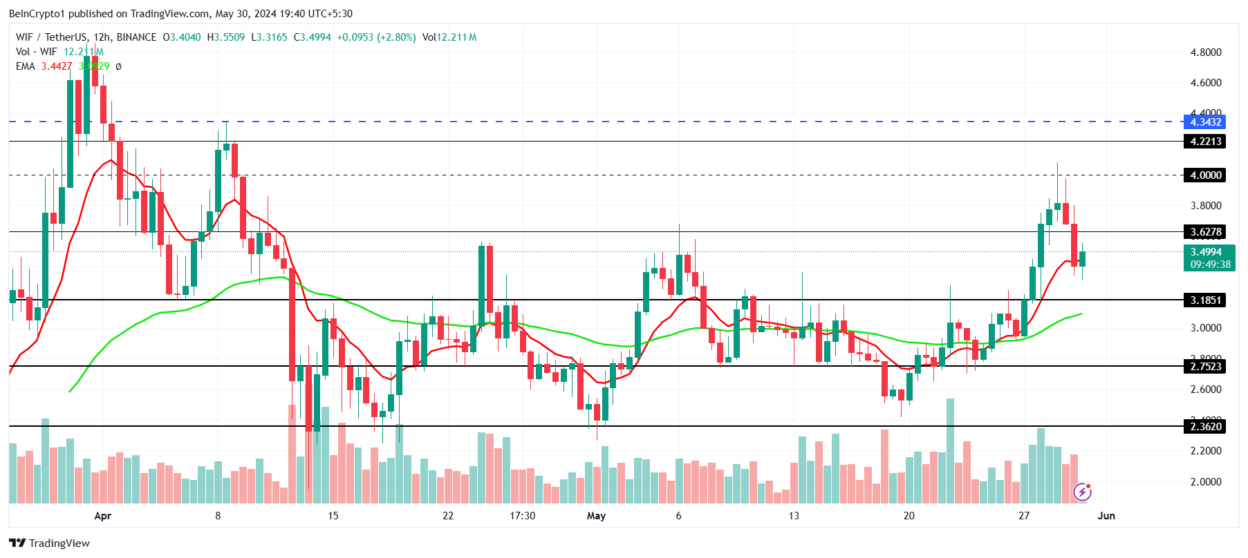 كانت خسارة سعر WIF لإمكانية الإغلاق فوق 4.00 دولارات بمثابة ضربة كبيرة ، لأن ذلك كان سيمكن العملة من تحقيق أعلى مستوى جديد على الإطلاق. ومع ذلك، لم يمنع هذا المستثمرين من التفاؤل بالتعافي والاستمرار في الارتفاع.
