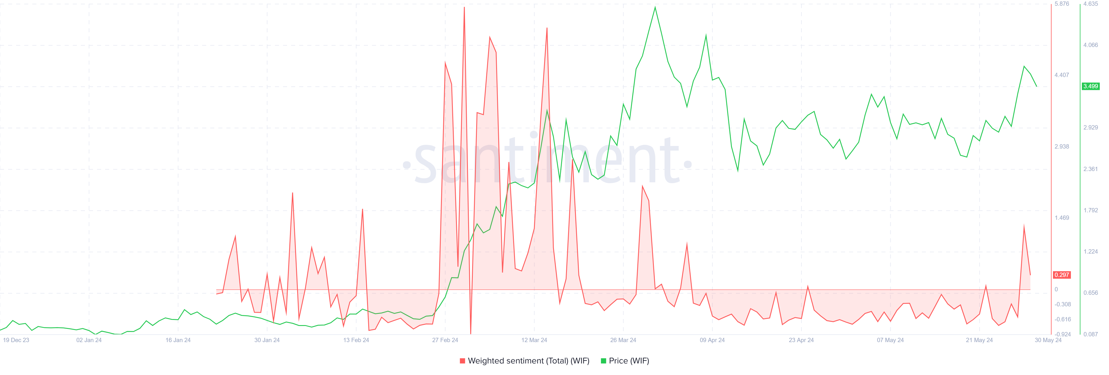 المشاعر العامة لحاملي عملة WIF إيجابية حاليًا، وهي أول حالة إيجابية منذ ما يقرب من شهرين. كانت آخر مرة كان فيها مستثمرو عملة WIF متفائلين بشأن العملة في أوائل أبريل عندما سجلت العملة أعلى مستوى لها على الإطلاق عند 4.85 دولار.