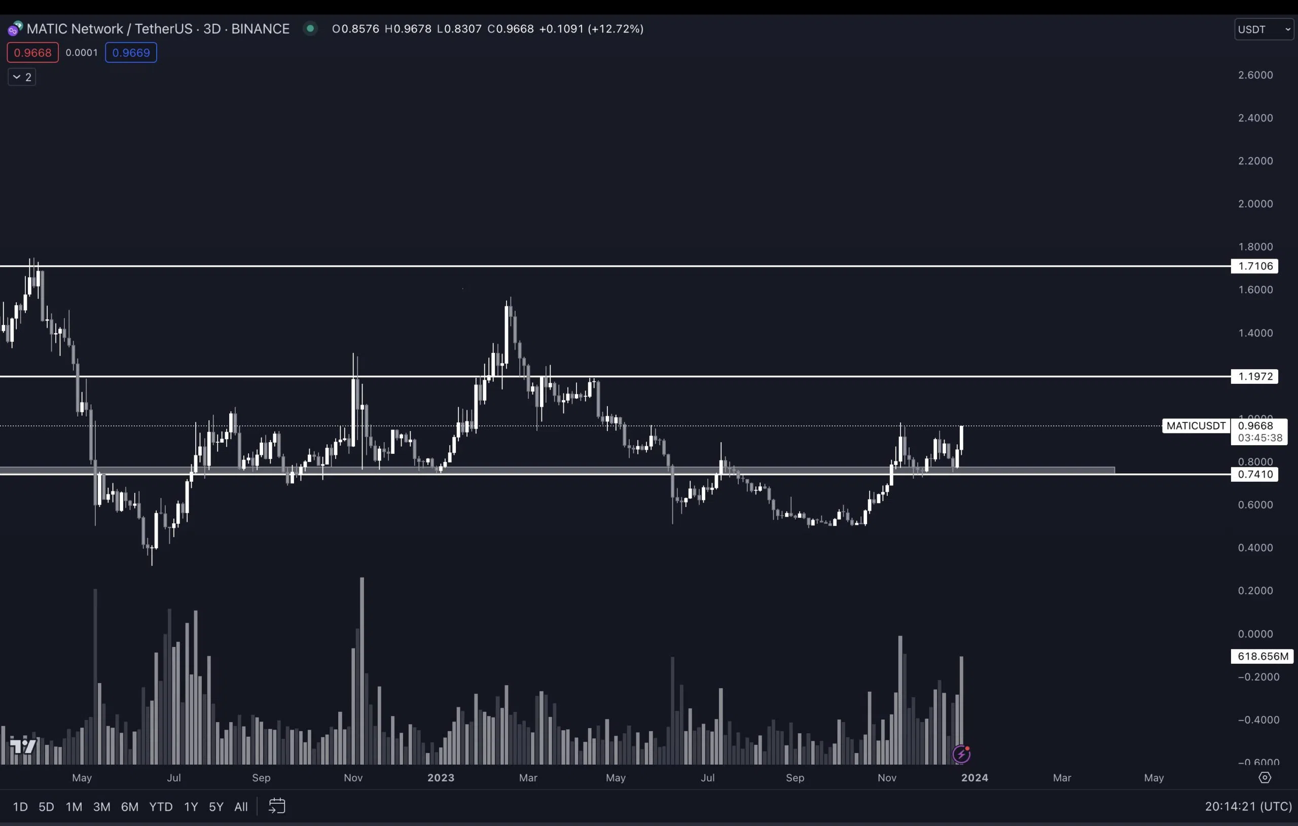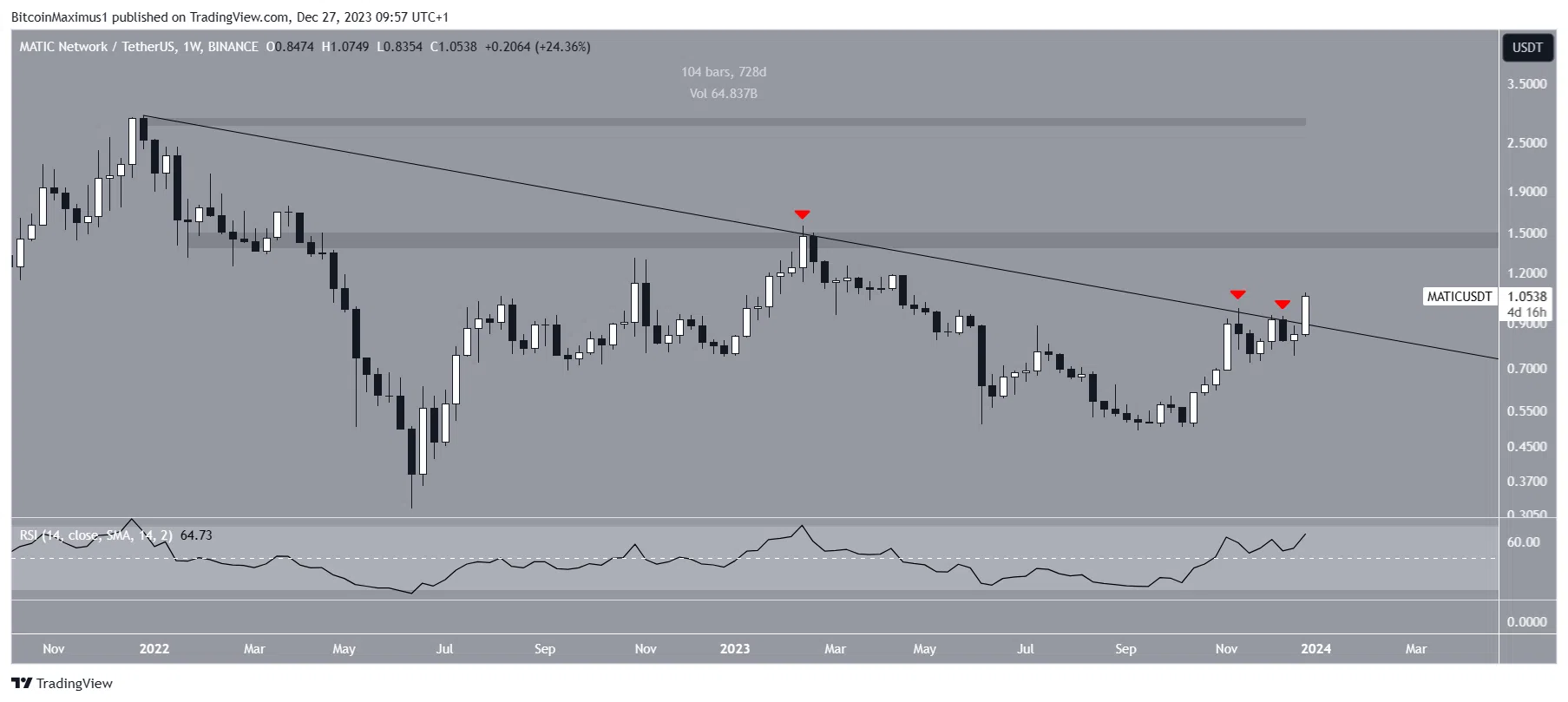 بعد بدء الحركة الصعودية، حاول MATIC الاختراق في فبراير 2023 (الرمز الأحمر) لكنه لم ينجح. وتلا ذلك محاولتان فاشلتان للاختراق في نوفمبر وديسمبر قبل أن ينفجر السعر أخيرًا هذا الأسبوع.