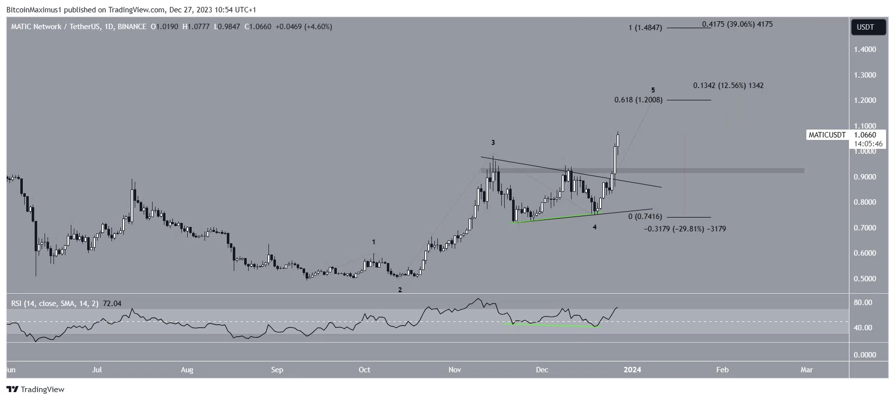 Sponsored Sponsoredيشير العدد الموجي الأكثر ترجيحًا إلى أن MATIC يقع في الموجة الخامسة والأخيرة من الحركة الصعودية (السوداء). الهدف الأول لقمة هذه الموجة إذا كان عند 1.20 دولار، أي 13% فوق السعر الحالي. تم العثور على الهدف بإعطاء الموجة الخامسة 0.618 ضعف طول الموجتين الأولى والثالثة مجتمعتين.