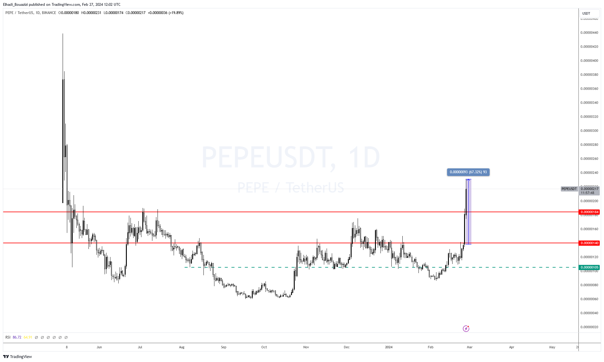 منذ ذلك الوقت بقي سعر بيبكوين PEPE يتداول في نطاقات جانبية. و مثل باقي عملات الميم الرئيسية الأخرى ، لم يواكب سوق العملات الرقمية الذي ارتفع بقوة منذ النصف الثاني من العام الماضي.