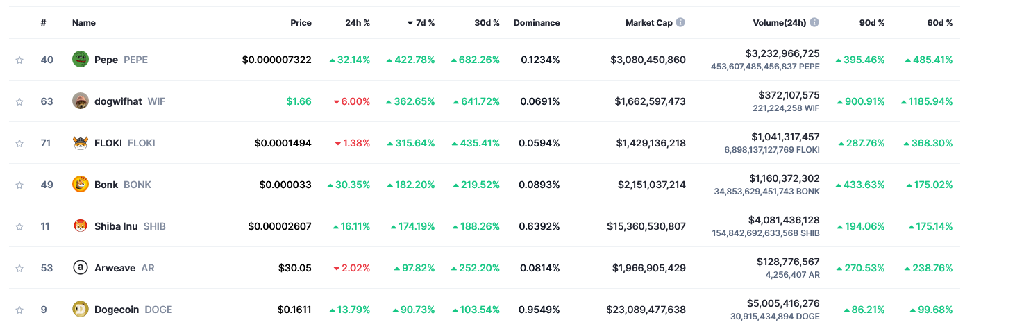 وتصدرت عملات بيبكوين (PEPE) شيباإينو SHIB وبونك (BONK) و دوجي ويفات (WIF) فلوكي (FLOKI) قائمة أكبر العملات الصاعدة، حيث احتل كل منها مكانًا ضمن المراكز الخمسة الأولى.