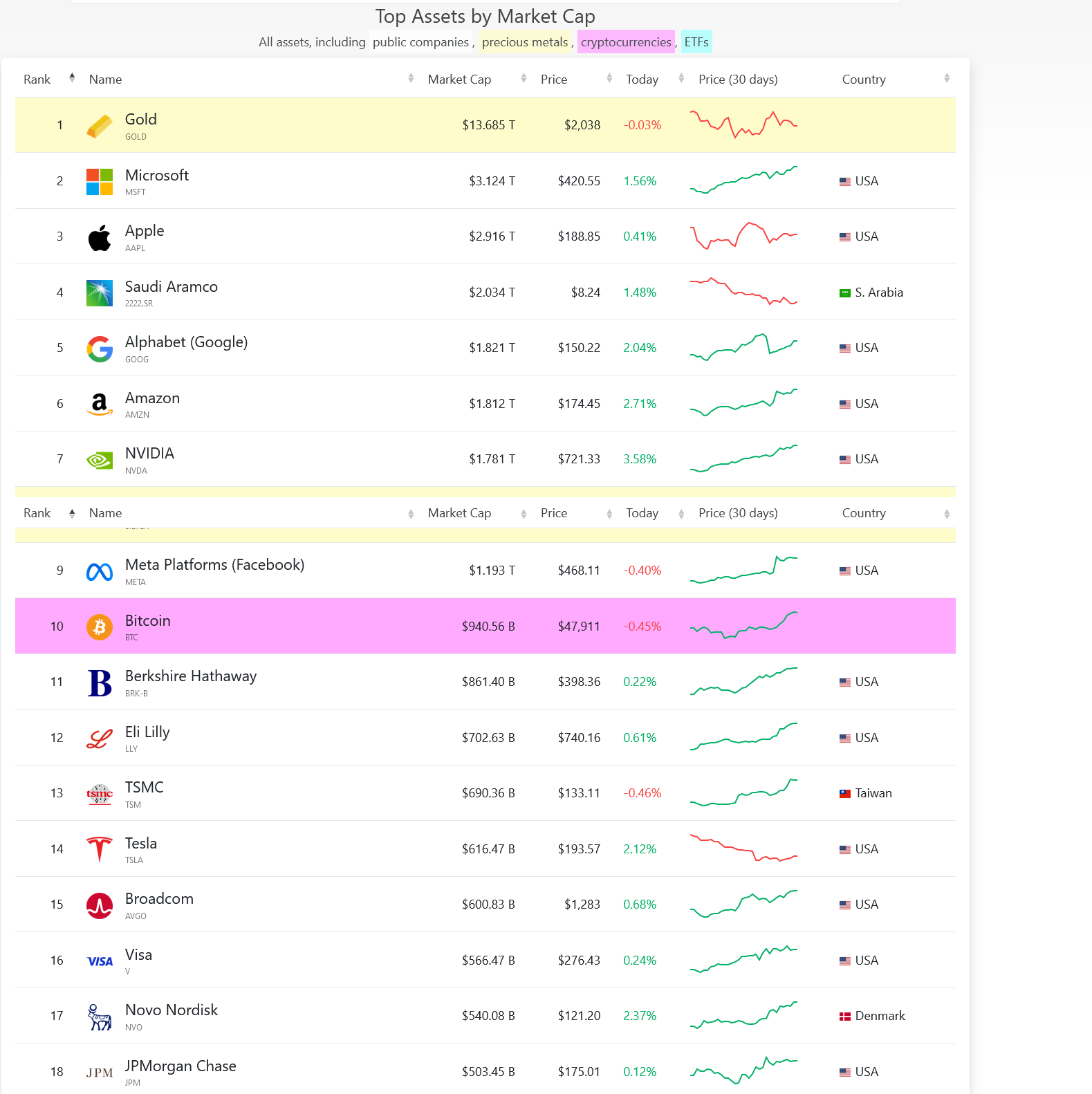 تصنيف شامل للأصول المالية في العالم يضع بيتكوين بجانب أصول أسواق المال التقليدية مثل الذهب والفضة. بالإضافة إلى عمالقة التكنولوجيا مثل مايكروسوفت Microsoft، آبل Apple، وأمازون Amazon.