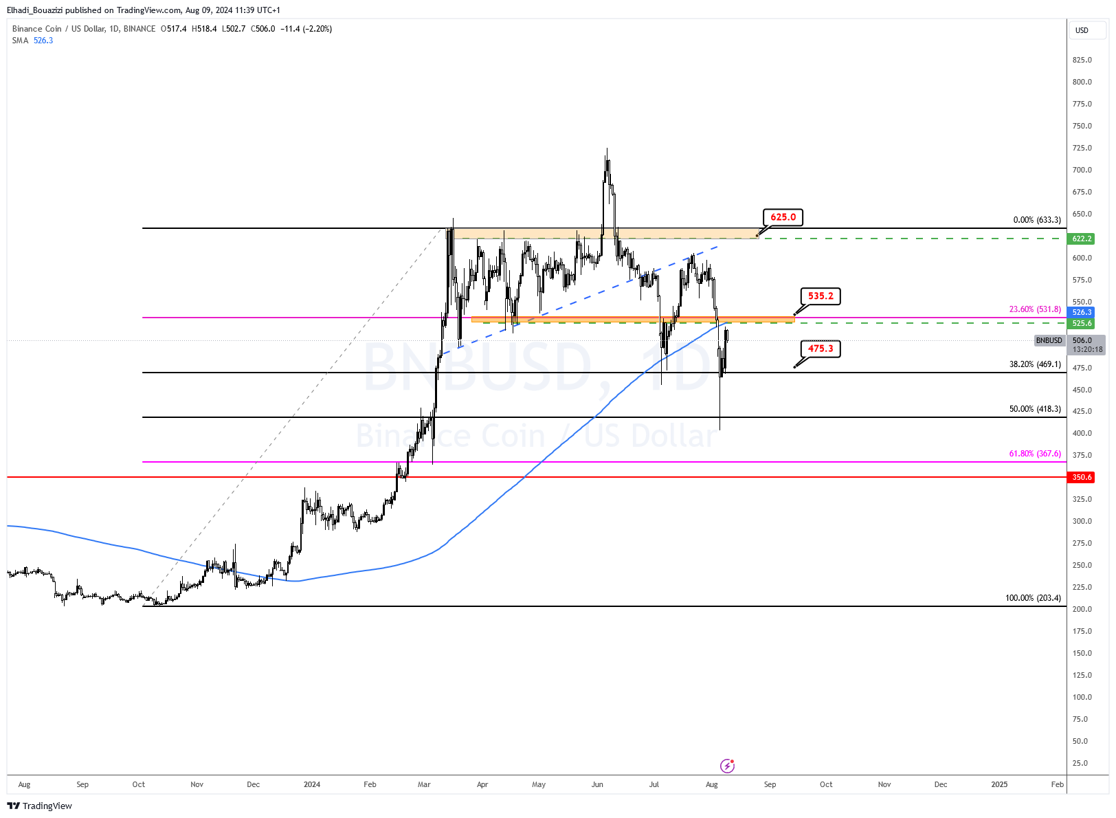 فنيا، سعر عملة BNB كان يتحرك في نطاق جانبي محصور بين تصحيح فيبوناتشي 530 – 625 دولار منذ نهاية موجة الارتفاع التي بدأت نهاية العام الماضي ( السوق الصاعد).
