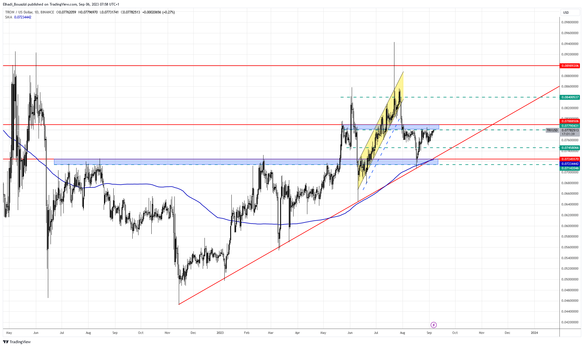 كما ذكرنا في المقدمة، سعر عملة ترون TRX يتحرك في اتجاه صاعد قوي منذ منتصف شهر نوفمبر الماضي. وكما نلاحظ على الرسم البياني اليومي فإن السعر يجد صعوبة كبيرة في اختراق مستوى منطقة المقاومة المحصورة بين المستويين 0.077 – 0.078 دولار.