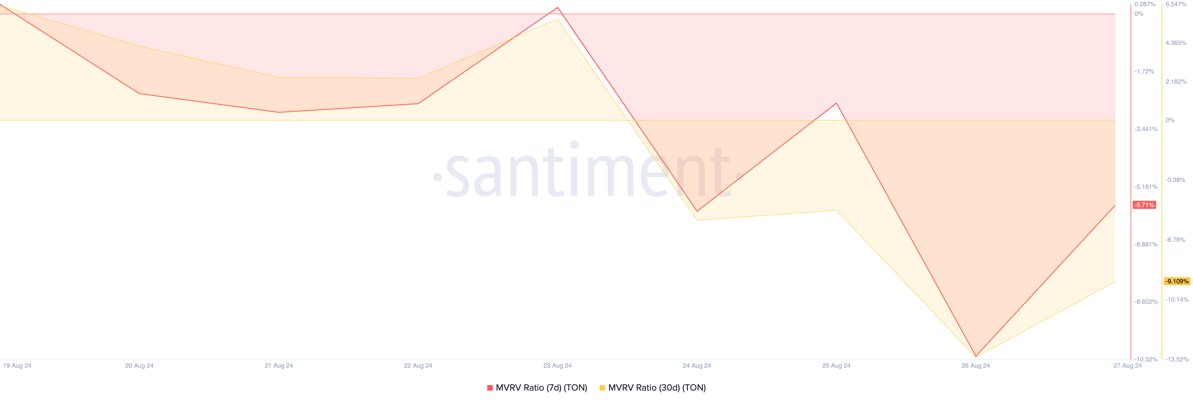 تشير نسب MVRV لعملة تونكوين (TON)، المحللة عبر متوسطات متحركة مختلفة، إلى أنه قد يكون الوقت الاستراتيجي لشراء العملة البديلة. تظهر البيانات من سانتيمنت أن نسب MVRV لمدة 7 أيام و30 يومًا تقف حاليًا عند -5,71% و-9,10% على التوالي.