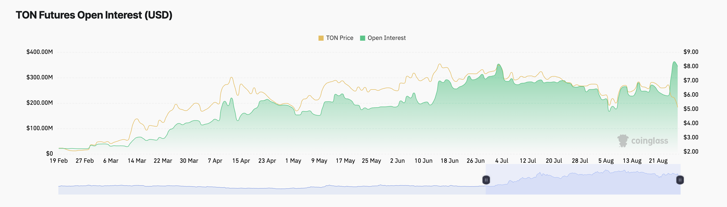 حاليًا، تقف الفائدة المفتوحة لعقود عملة TON الآجلة عند 345 مليون دولار، بزيادة 46% منذ اعتقال دوروف. تقيس الفائدة المفتوحة الإجمالية عدد العقود غير المستقرة، ويشير الزيادة إلى مشاركة متزايدة من المتداولين الذين يفتحون مراكز جديدة.