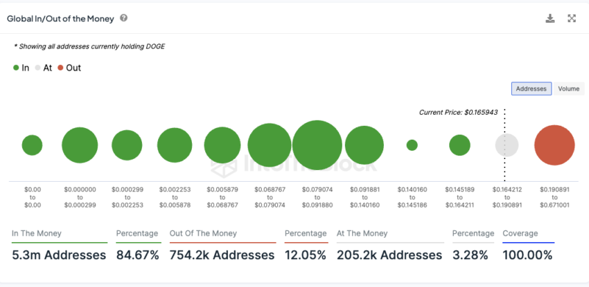 بالنظر عن كثب إلى بيانات البلوكشين المقدمة من IntoTheBlock، وهي أداة تحليلات قيّمة للعملات الرقمية، نجد أن ما يقرب من 85% من عناوين Dogecoin تقع حاليًا في المنطقة الخضراء، مما يشير إلى تحقيق الأرباح.