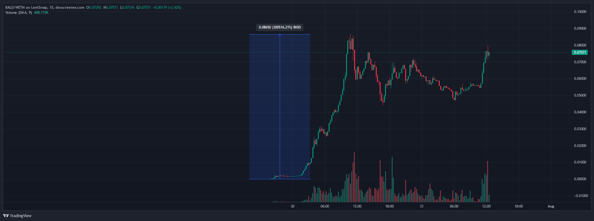 الإطلاق الرسمي للعملة كان يوم 29 يوليو على الساعة 8 مساءا على منصة LeetSwap حيث ارتفاع سعر عملة BALD من الصفر إلى مستوى 0.086 دولار بعد أقل من 24 سا. ما رفع قيمتها السوقية من الصفر إلى 50 مليون دولار في يوم واحد، بنسبة نمو فافت 40,000%.
