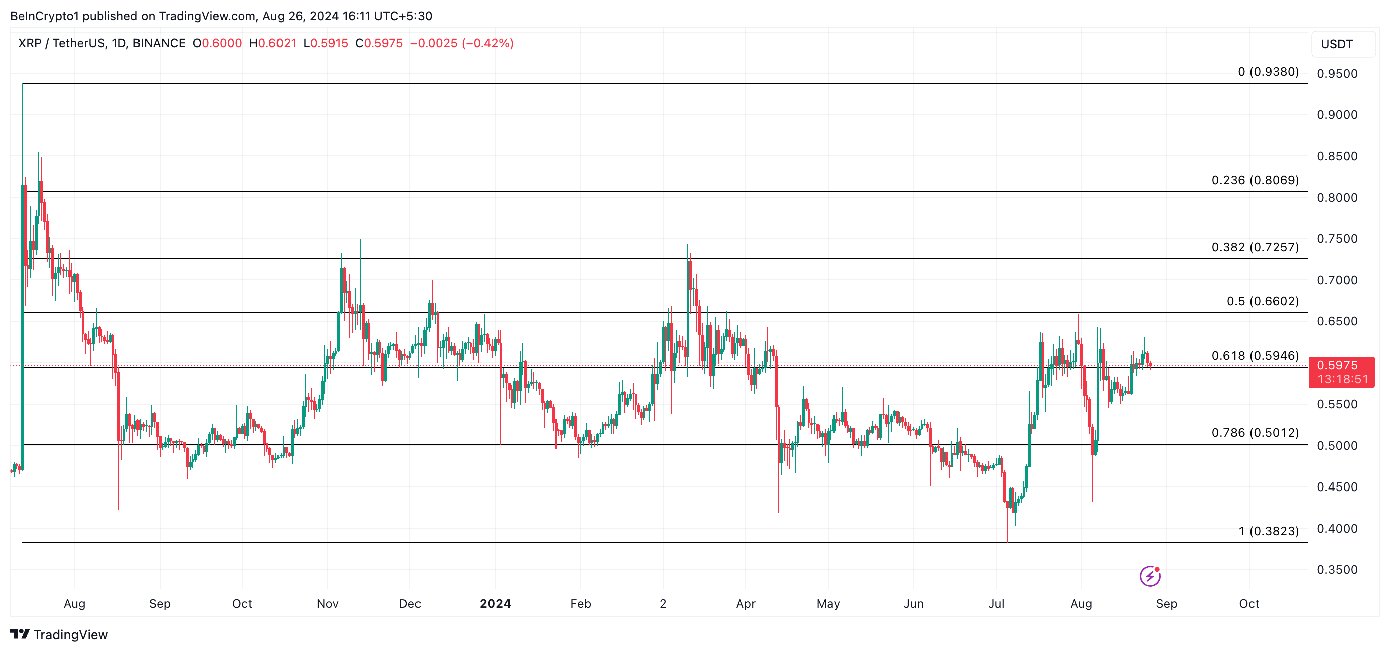 عانى سعر علمة ريبل XRP من الخروج من نطاق تداوله طوال أغسطس. منذ 9 أغسطس، واجه العملة البديلة مقاومة باستمرار عند 0,61$ ووجد دعمًا عند 0,58$.
