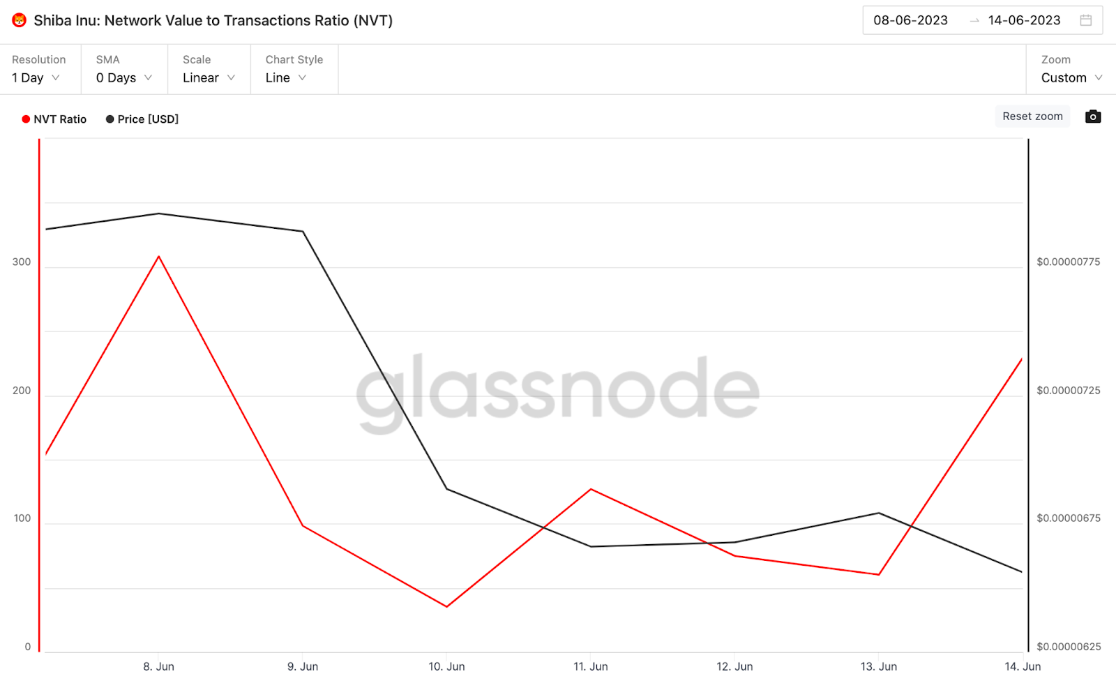 وفقًا للجدول أدناه، فقدت عملة الشيبا رونقها منذ 10 يونيو. وفي الفترة بين 10 يونيو و 14 يونيو، ارتفعت نسبة تقييم معاملات SHIBA INU إلى ما يقترب من 550% من 35.29 إلى 229.56.