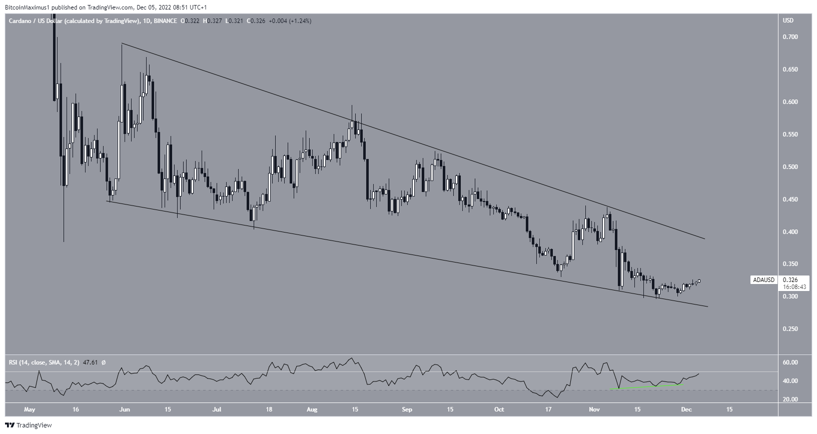 وسوف يؤكد الاختراق للقناة أن سعر عملة كاردانو ADA ستتحرك باتجاه خط مقاومة الوتد، وقد يشير ايضا الانخفاض إلى ما دون منطقة 0.32 دولار إلى احتمالية حدوث القيعان الجديدة.