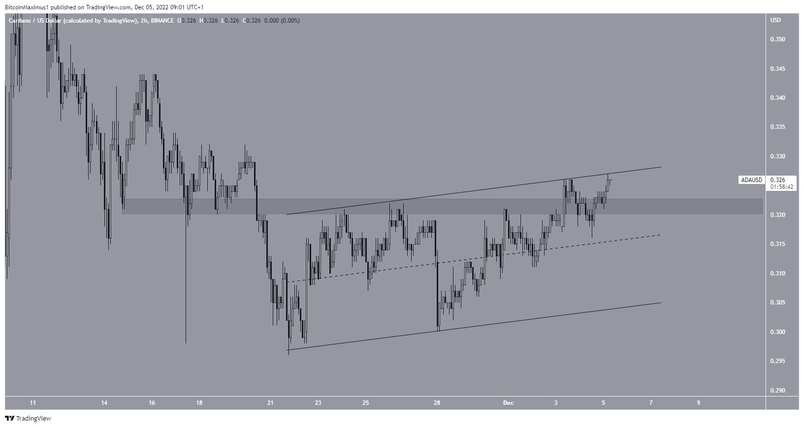 ويظهر الرسم البياني قصير المدى لفترة ساعتين أن سعر العملة يتداول عند خط المقاومة للقناة الموازية التصاعدية ولكنه استعاد منطقة المقاومة عند 0.32 دولار.