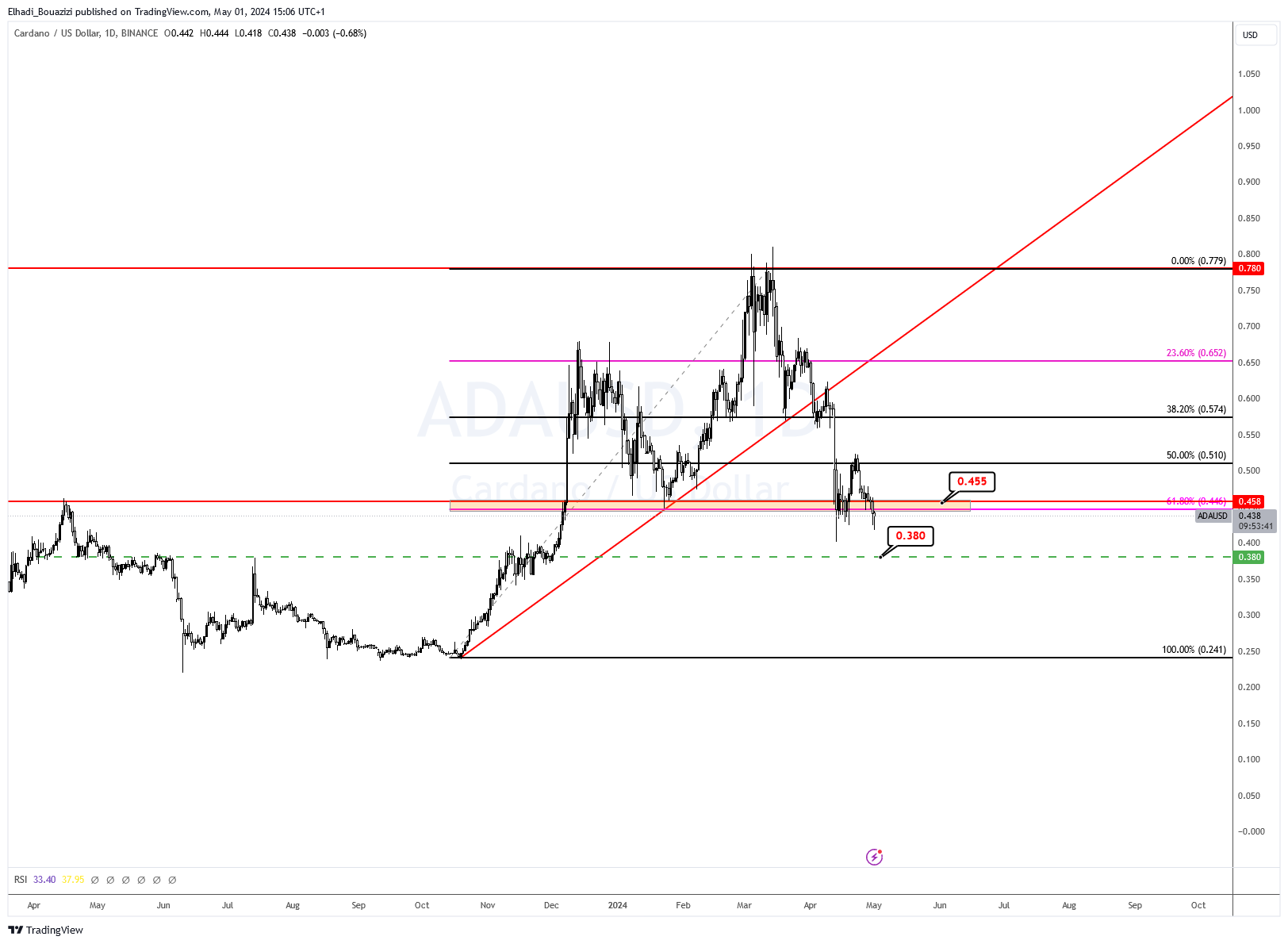 السؤال الآن، هو إلى أي مدى يمكن أن يهبط سعر عملة كاردانو ADA قبل أن ينتهي التصحيح؟
