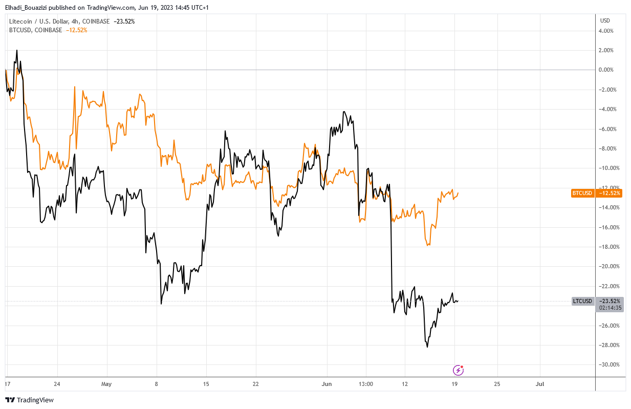تراجعت عملة لايتكوين بقوة في الأيام الماضية التي شهدت اضطرابات قوية في سوق العملات الرقمية. بسبب التشديد الرقابي والتنظيم في الولايات المتحدة الأمريكية بعد رفع دعاوي قضائية ضد اثنين من أكبر بورصات تداول العملات الرقمية. وتصنيف العديد كأرواق مالية غير مسجلّة. ثم زاد تلميح البنك الفيدرالي برفع أسعار الفائدة مرتين على الأقل حتى نهاية العام.