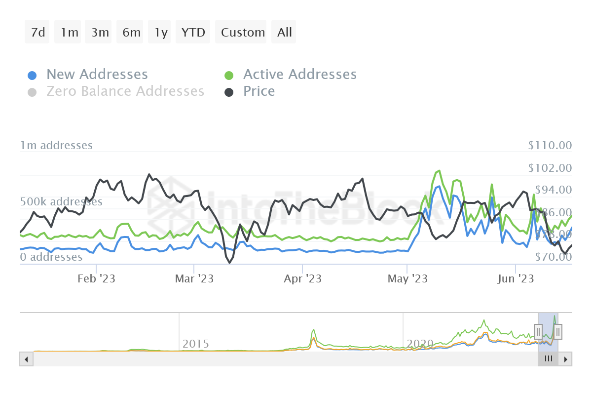 قبل ذلك كان أداء السعر مستقرًا على العموم. خاصة بعد أن اكتسب بعض الدعم من ارتفاع تكلفة المعاملات على شبكة البيتكوين. ما دفع الكثيرين إلى الانتقال إلى شبكة لايتكوين. ويمكننا ملاحظة ذلك في الرسم البياني المرفق الذي يوضح ارتفاع ملحوظ في عدد العناوين الجديدة وأيضًا النشطة. وبالضبط منذ اليوم الأول لشهر مايو الماضي. حسب آخر البيانات الحديثة من منصة IntoTheBlock. .