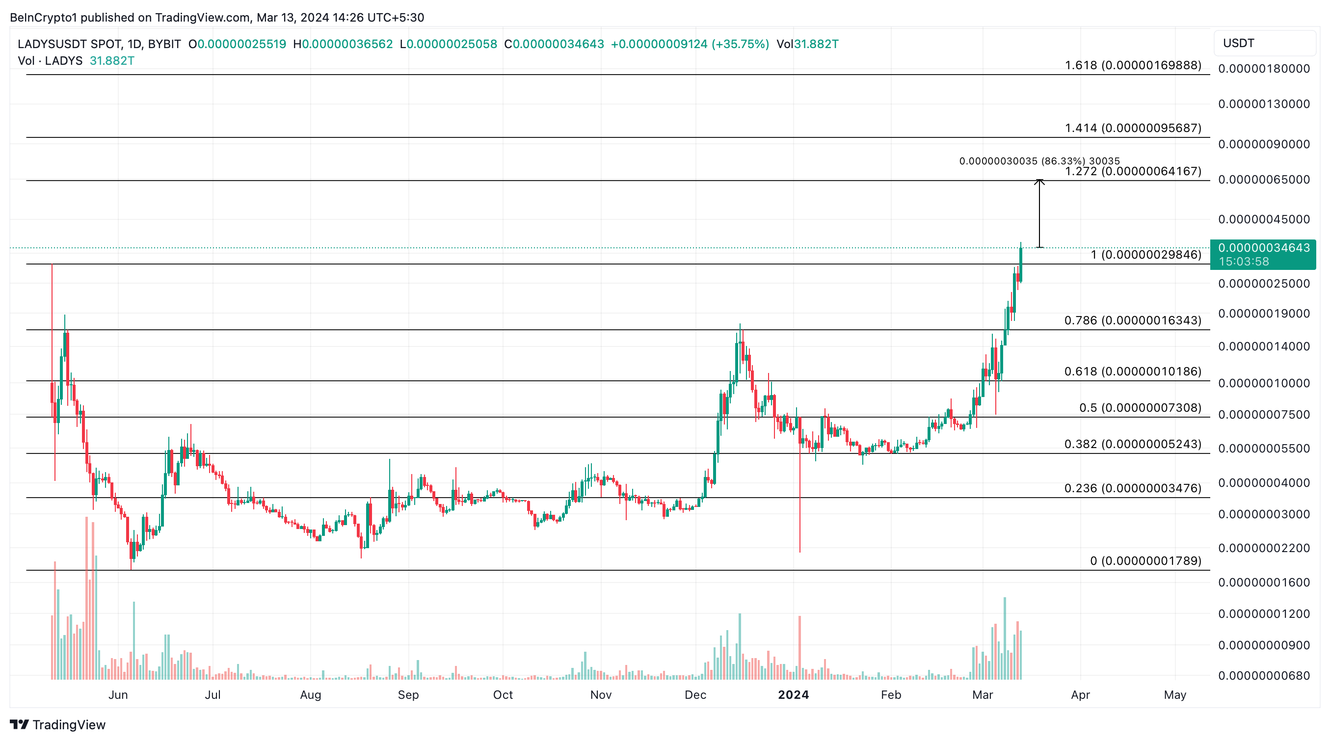 ومع ذلك، يستخدم المحللون مستويات تصحيح فيبوناتشي من أعلى المستويات السابقة على الإطلاق إلى القاع للتنبؤ بالمقاومات المحتملة. هناك مقاومة كبيرة عند مستوى 0.0000006416 دولار، وهو مستوى فيبوناتشي 1.272 الرئيسي. ومن المثير للاهتمام، من المحتمل أن يرتفع LADYS بنسبة 86% أخرى قبل مواجهة هذه المقاومة.