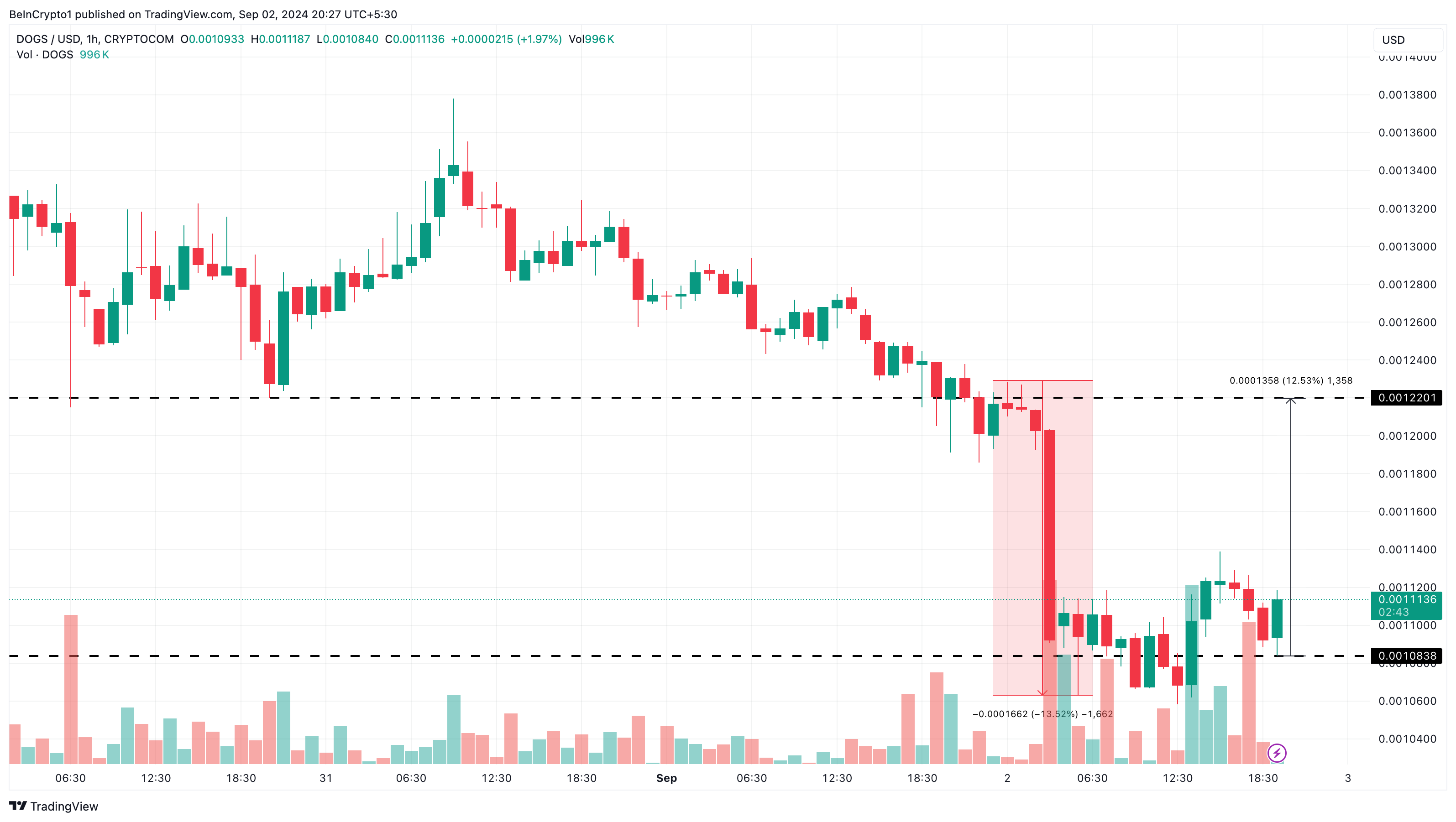 تشير التحليلات الإضافية للرسم البياني الساعي إلى أن DOGS قد تكون في طريقها لاكتشاف السعر، وهي عملية تحددها العرض والطلب حيث يحدد المشترون والبائعون القيمة العادلة للرمز.
