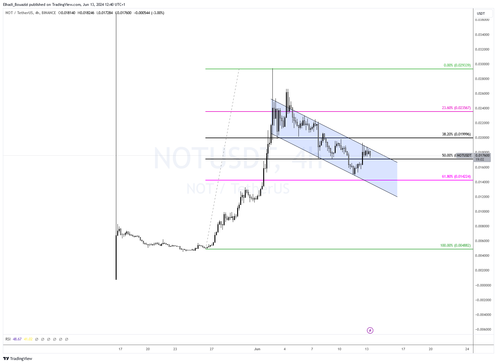 رغم حداثة بيانات عملة نوتكوين NOT إلا أنها تحترم جيدا المستويات الفنية الكلاسيكية، و تحديدا تصحيحات فيبوناتشي و القناة السعرية الهابطة، كما هو موضح في الرسم البياني المرفق.