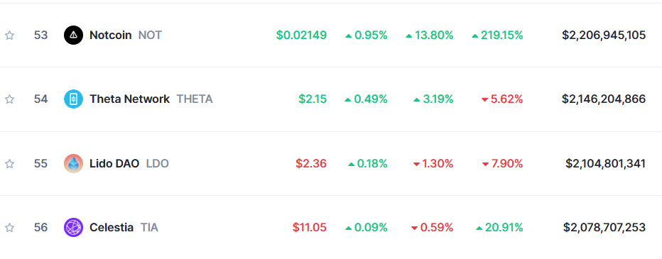 وقد أدى هذا الارتفاع الأخير إلى تفوق نوتكوين على عملات مثل Lido DAO (LDO) و Celestia (TIA) و ThorChain (RUNE) و Fetch.ai (FET) وغيرها. وتستهدف العملة الآن تجاوز Fantom (FTM) و بونك BONK للوصول إلى قائمة أكبر 50 عملة رقمية في السوق .
