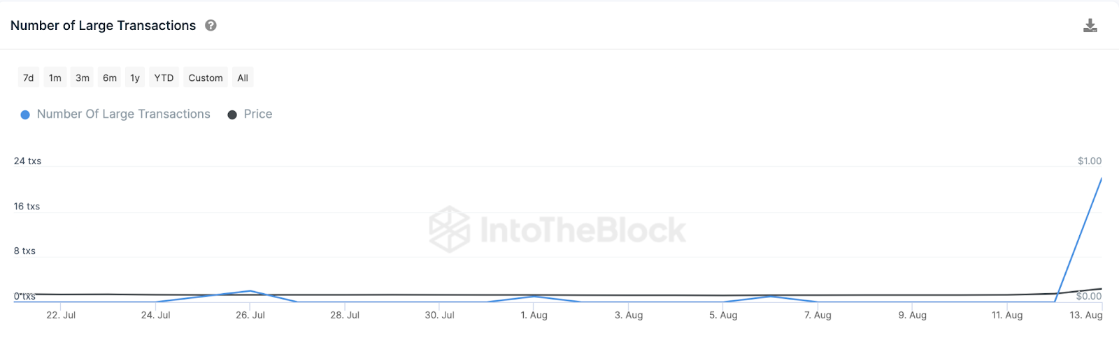على الجانب الآخر، كشفت البيانات على السلسلة عن نشاط تجاري غير معتاد بين حيتان شبكة العملة Bluzelle خلال الأيام القليلة الماضية. حيث يوضح الرسم البياني من منصة IntoTheBlock أدناه أن شبكة BLZ سجلت 22 صفقة كبيرة في 13 أغسطس. ليمثل هذا أربعة أضعاف ما تم تسجيله في أيام التداول الثلاثين السابقة مجتمعة.