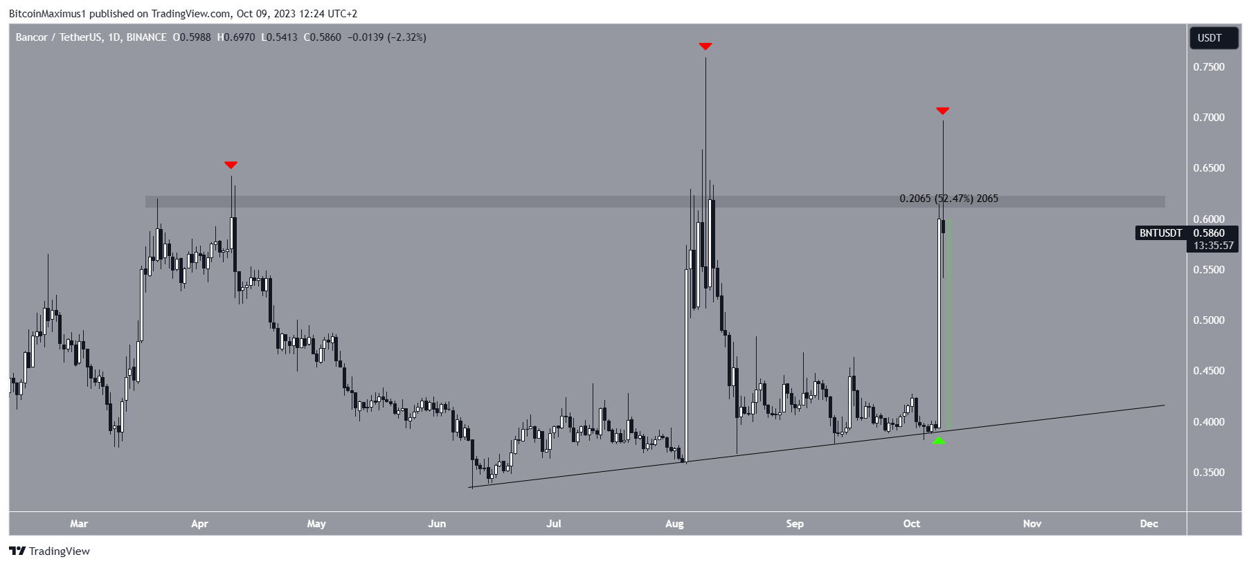 منذ شهر يونيو، ارتفع سعر Bancor أيضًا جنبًا إلى جنب مع خط الدعم الصاعد. كما ارتد BNT عند الخط في 8 أكتوبر، مرتفعًا بنسبة 52%.