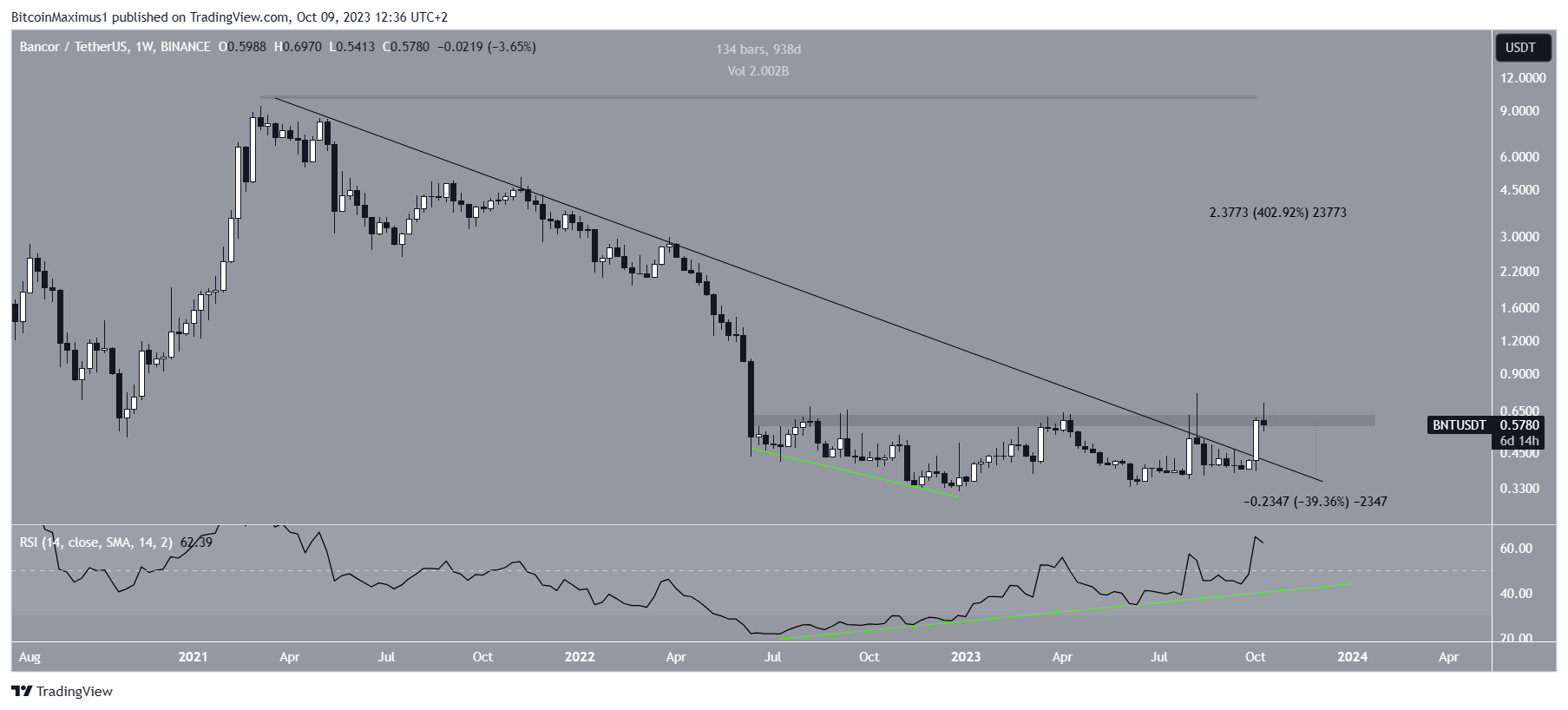 السبب الرئيسي لذلك هو أن سعر عملة BNT اخترق الأسبوع الماضي خط الاتجاه الهبوطي الذي دام 940 يومًا. غالبًا ما تؤدي الاختراقات من خطوط الاتجاه طويلة المدى إلى زيادات كبيرة. أدى الاختراق إلى دخول BNT إلى منطقة المقاومة البالغة 0.60 دولار.