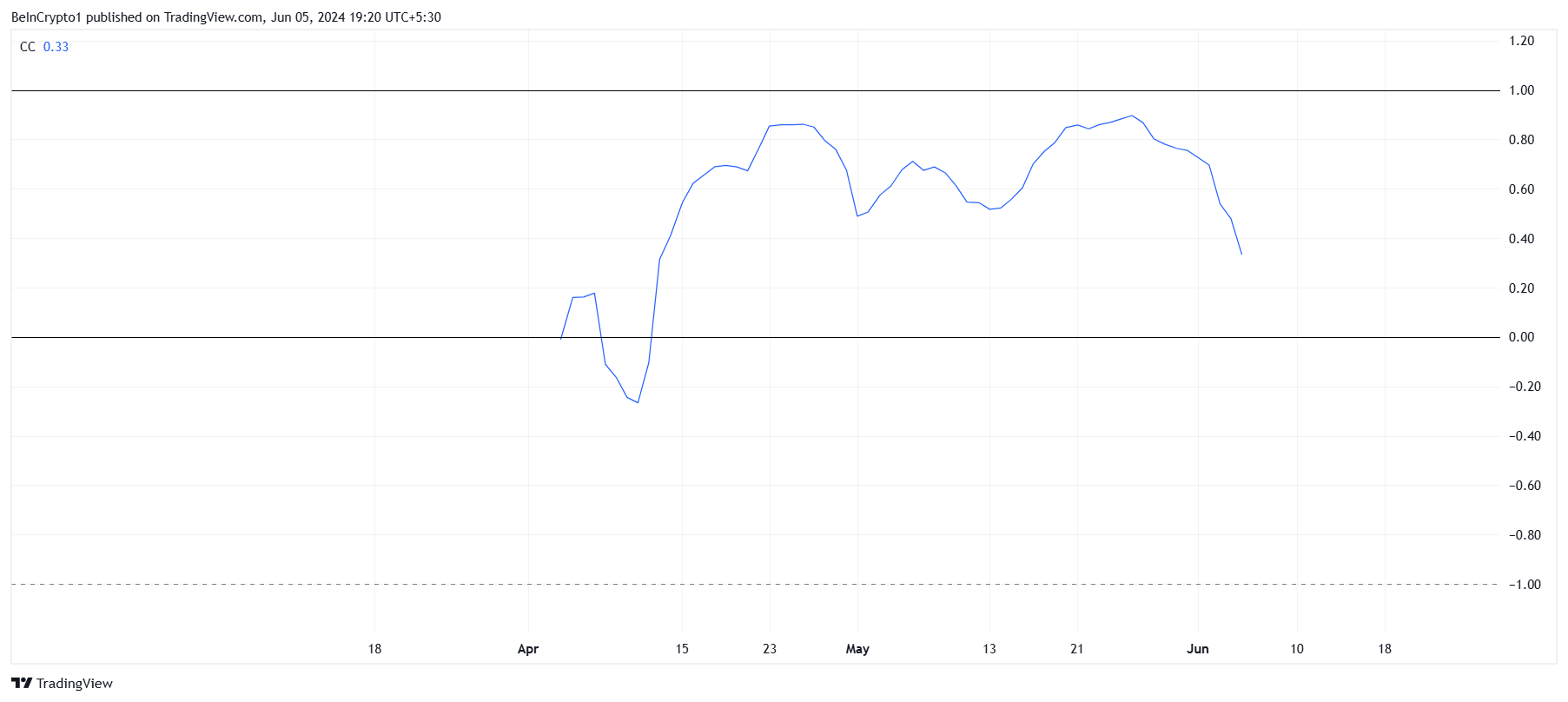 ينشأ هذا الهبوط من انخفاض الارتباط بين بوم وأكبر أصل تشفير في العالم، بيتكوين. حققت BTC أداء جيدا في اليومين الماضيين، حيث تجاوزت 70 ألف دولار خلال ال 48 ساعة الماضية.