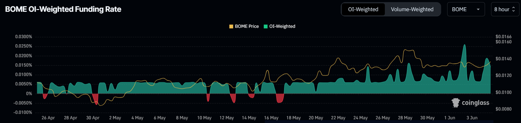 يشير معدل التمويل الإيجابي إلى هيمنة العقود الطويلة في السوق. من ناحية أخرى، تشير المعدلات السلبية إلى أن العقود القصيرة أكثر هيمنة. في حالة BOME، يقاوم الأول هبوط السوق الأوسع.