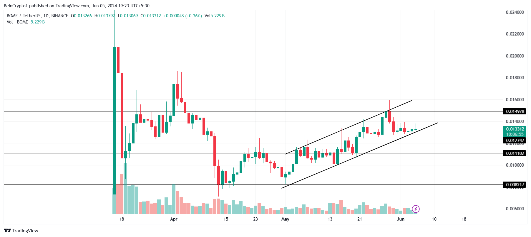 تم اختبار هذا النطاق كدعم ومقاومة عدة مرات في الماضي، ويمكن تكرار نفس الشيء. إذا ظلت القناة الصاعدة سليمة، فقد يؤدي هذا التماسك إلى الاختراق، مما يؤدي إلى إرسال BOME فوق 0.016 دولار.