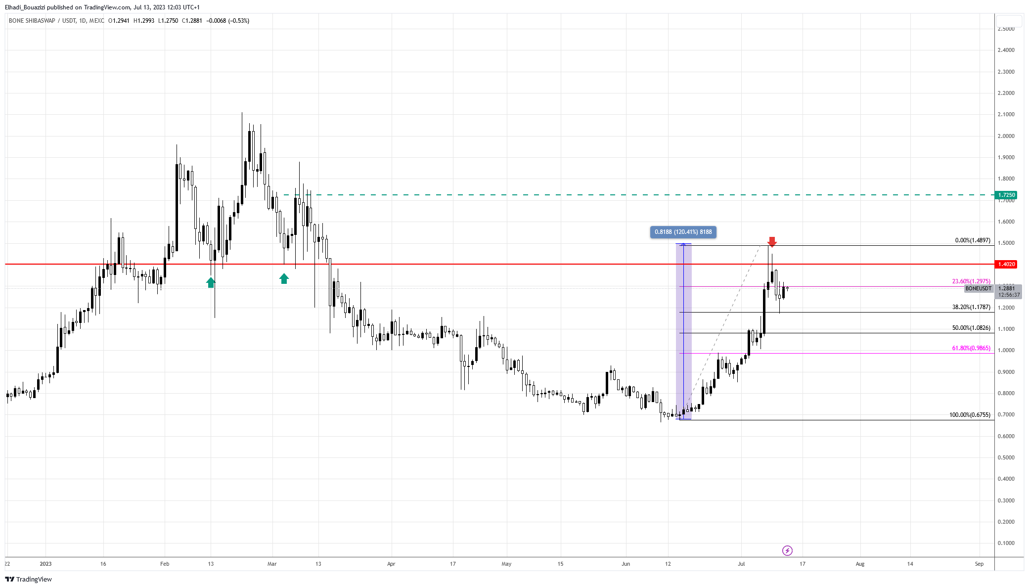 فنيًا، توقف سعر BONE تحت مستوى المقاومة 1.40 دولار في موجة الصعود الأخيرة. كما أن موجة التصحيح الهابطة توقفت عند مستوى تصحيح فيبوناتشي 38.2% عند مستوى 1.17 دولار.