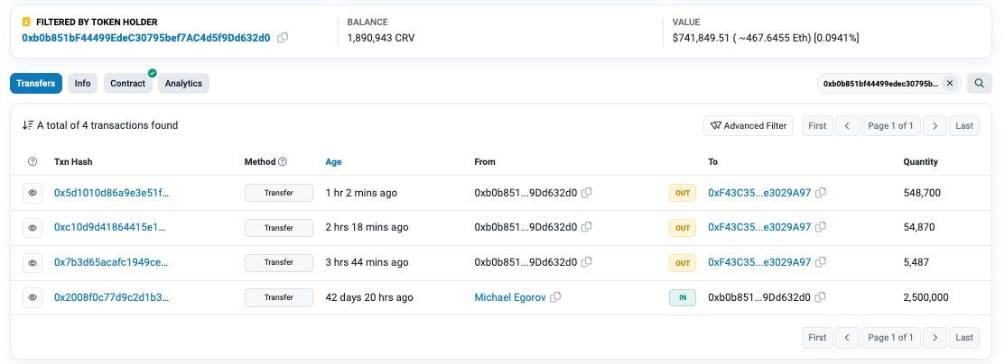 ويظهر سعر CRV معرض للخطر حيث كشفت منصة PeckShield، المتخصصة في التحقيقات الأمنية والبلوك تشين، عن معاملات غير عادية عبر السلسلة من عناوين المحفظة المرتبطة بالمؤسس مايكل إيجوروف.
