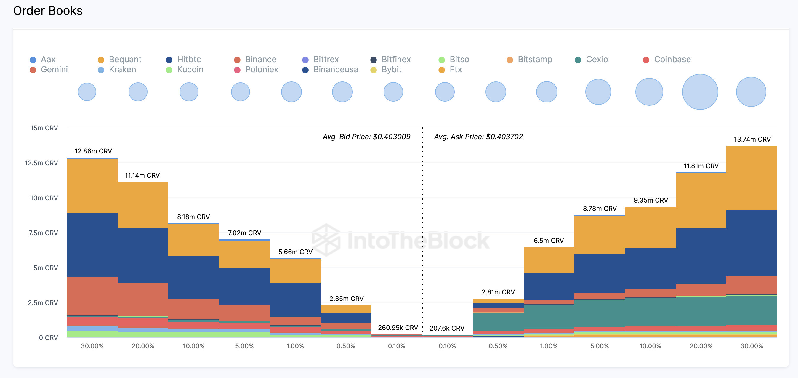 على الجانب الآخر، ففي أعقاب معاملات إيجوروف غير العادية، استجاب متداولو CRV من خلال زيادة أوامر البيع. ووفقًا لبيانات من دفاتر الطلبات لـ 17 بورصة المعترف بها. بما في ذلك بينانس وكراكن وكوين بيز، فقد وضع المستثمرون معظم طلبات البيع الخاصة بهم قبل سعر التصفية البالغ 0.371 دولار.