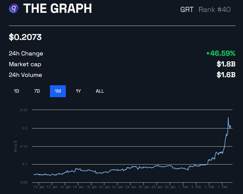 ومنذ بداية العام، ارتفع سعر عملة GRT بنسبة 260% لتتفوق على عملات التشفير، حيث ارتفاع سعر الأصل بأكثر من الضعف خلال الأسبوع الماضي.
