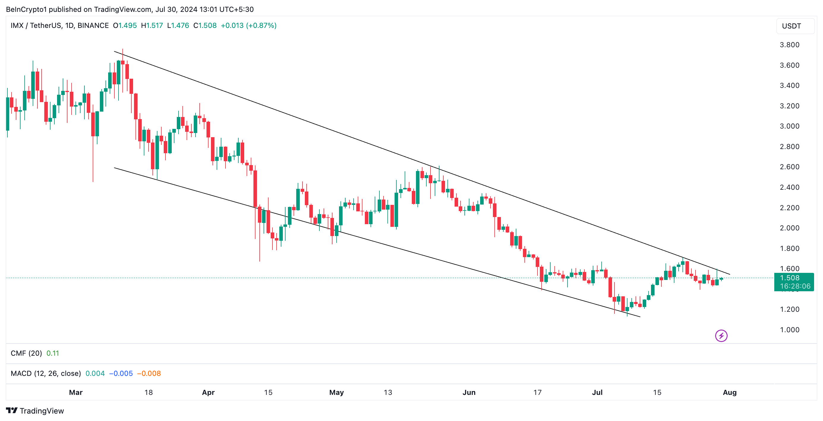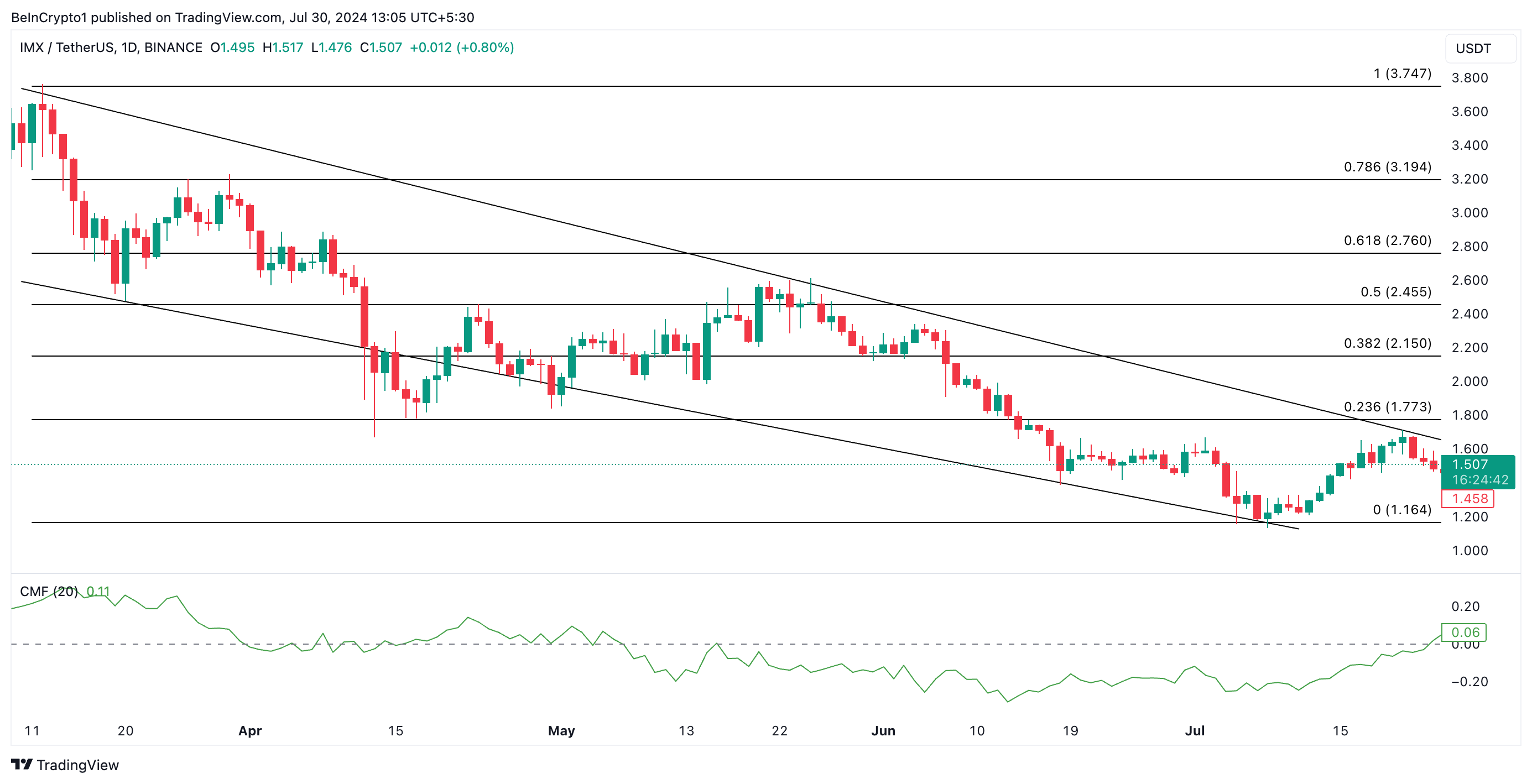 يتداول سعر عملة IMX، كما هو موضح في الرسم البياني اليومي، ضمن قناة هابطة منذ 12 مارس، عندما أغلق عند أعلى مستوى له في العام حتى تاريخه عند 3.60 دولار. انخفض سعر العملة الرقمية البديلة منذ ذلك الحين بنسبة 58٪.