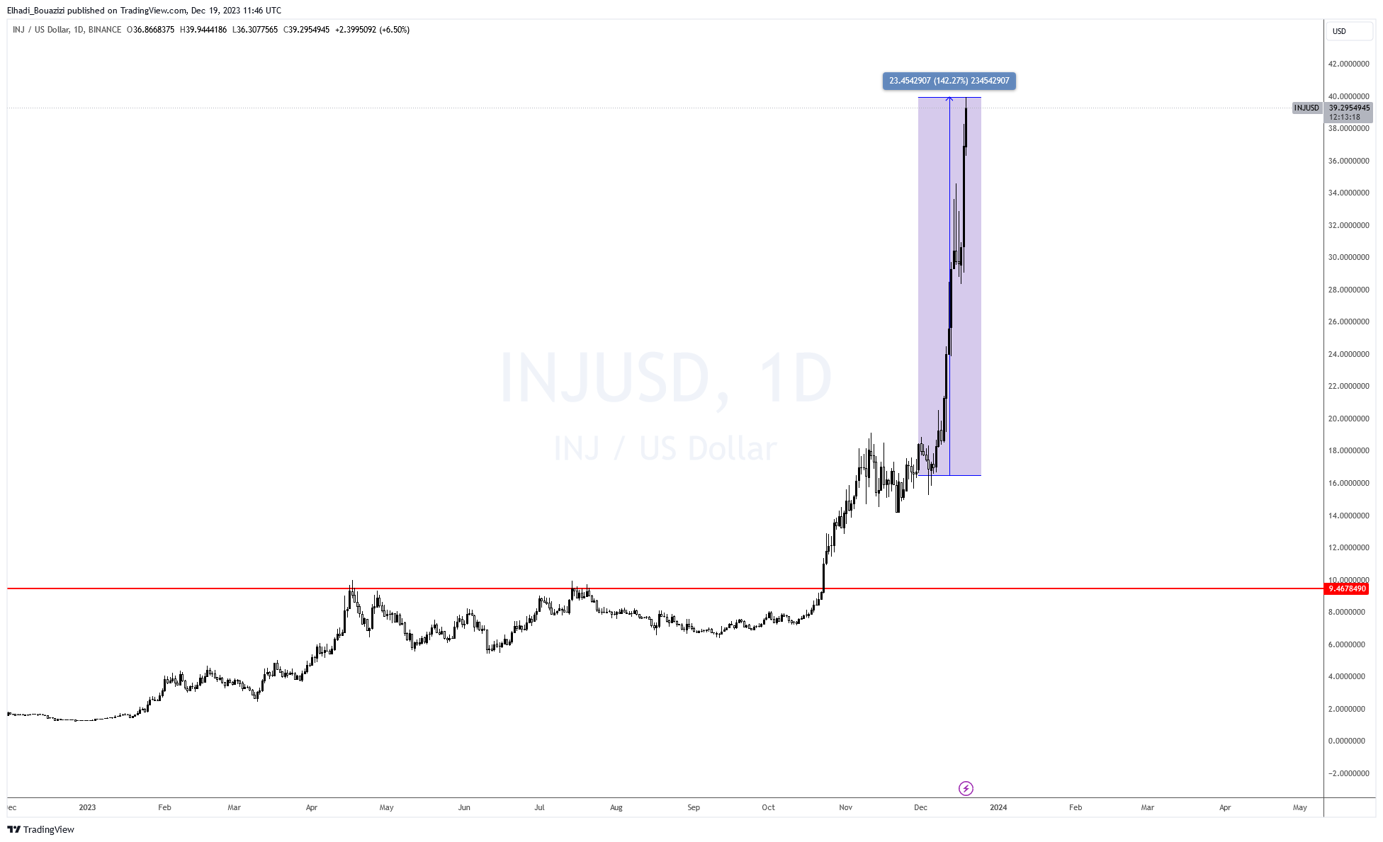 في الأيام القليلة الماضية تصدر سعر عملة INJ قائمة أفضل العملات الرقمية. حيث سجلت ارتفاع أكثر 140% منذ بداية الشهر الجاري. وبلغت أعلى مستوياتها القياسية على الإطلاق عند 39.95 دولار. السبب الرئيسي والمحفّز لهذه الصعود كان إدراج هذه العملة الرقمية للتداول في منصة OKX. حيث أن ظروف السوق الحالية إضافة إلى التحديثات والتطويرات في الشبكة كان مهيئة أيضًا لانفجار السعر.