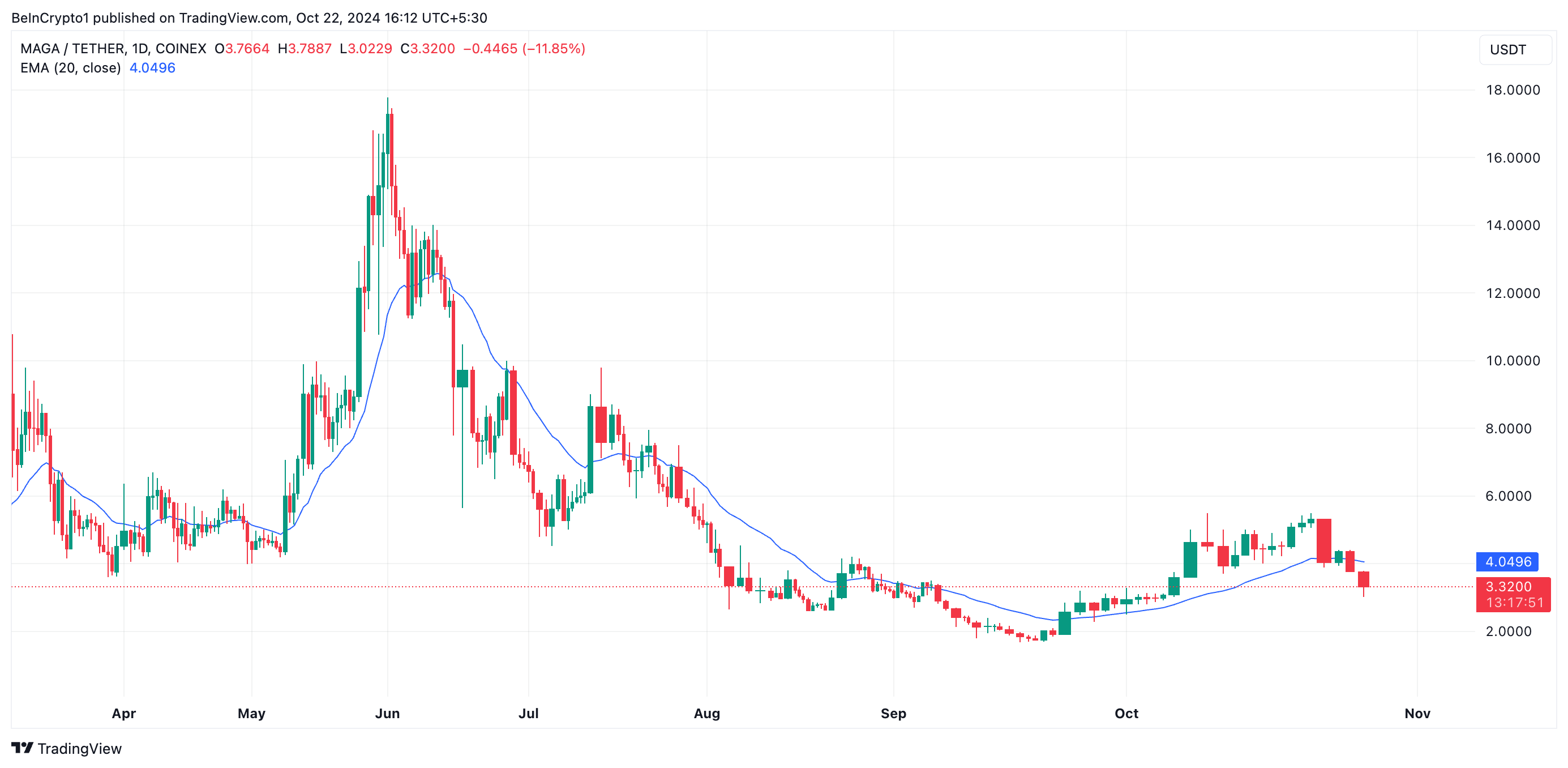 شهد سعر عملة MAGA TRUMP انخفاضًا ملحوظًا في الأسابيع القليلة الماضية. العملة الميمية المستوحاة من ترامب تتداول الآن بسعر 3,31$، مما يعكس انخفاضًا بنسبة 27% خلال الأسبوع الماضي.