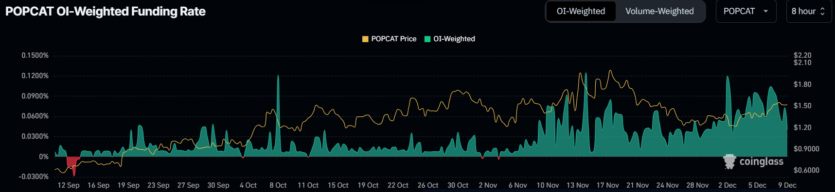 رغم التراجع الأخير، يظل المتداولون متفائلين نسبياً بشأن مستقبل POPCAT. استمرت عملة الميم في جذب انتباه المستثمرين الأفراد، كما يتضح من معدل التمويل الإيجابي. يشير هذا إلى أن العديد من المتداولين يراهنون على استمرار الاتجاه الصعودي. تعكس معدلات التمويل العالية عادةً اهتماماً قوياً بالشراء، مما قد يساعد POPCAT في الحفاظ على الزخم الصعودي.