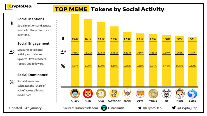 وبحسب بوابة LunarCrush في الرابع والعشرين من يناير فقد تم الكشف عن عملات الميم التي تحتل المرتبة الأولى من حيث تفاعل مجتمع التشفير.