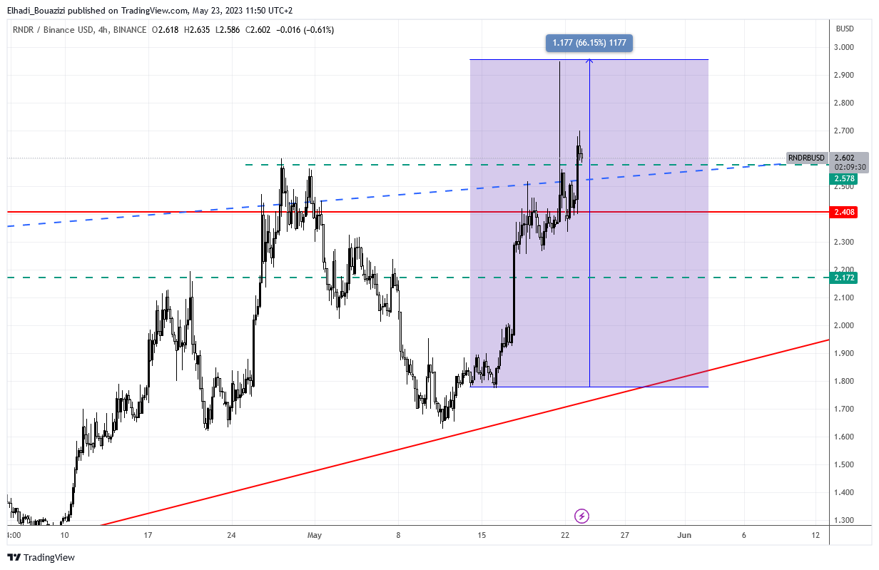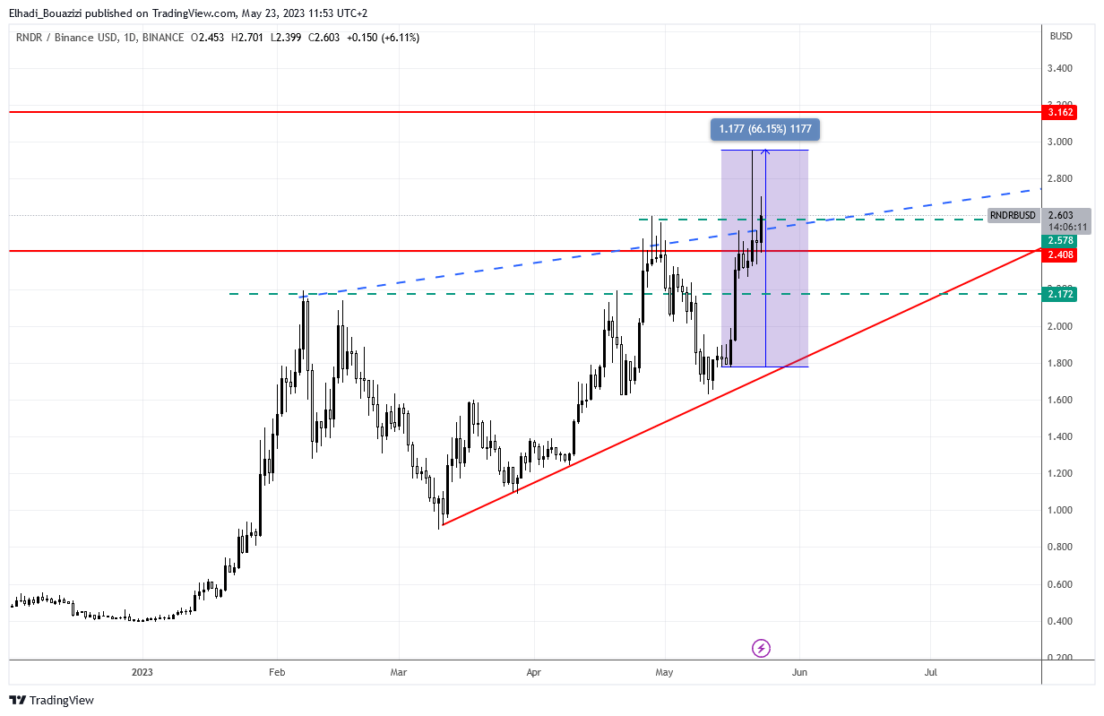 على الرسم البياني، تمكن سعر عملة راندر RNDR اختراق مستوى المقاومة 2.40 دولار على الرسم البياني اليومي منذ يومين.