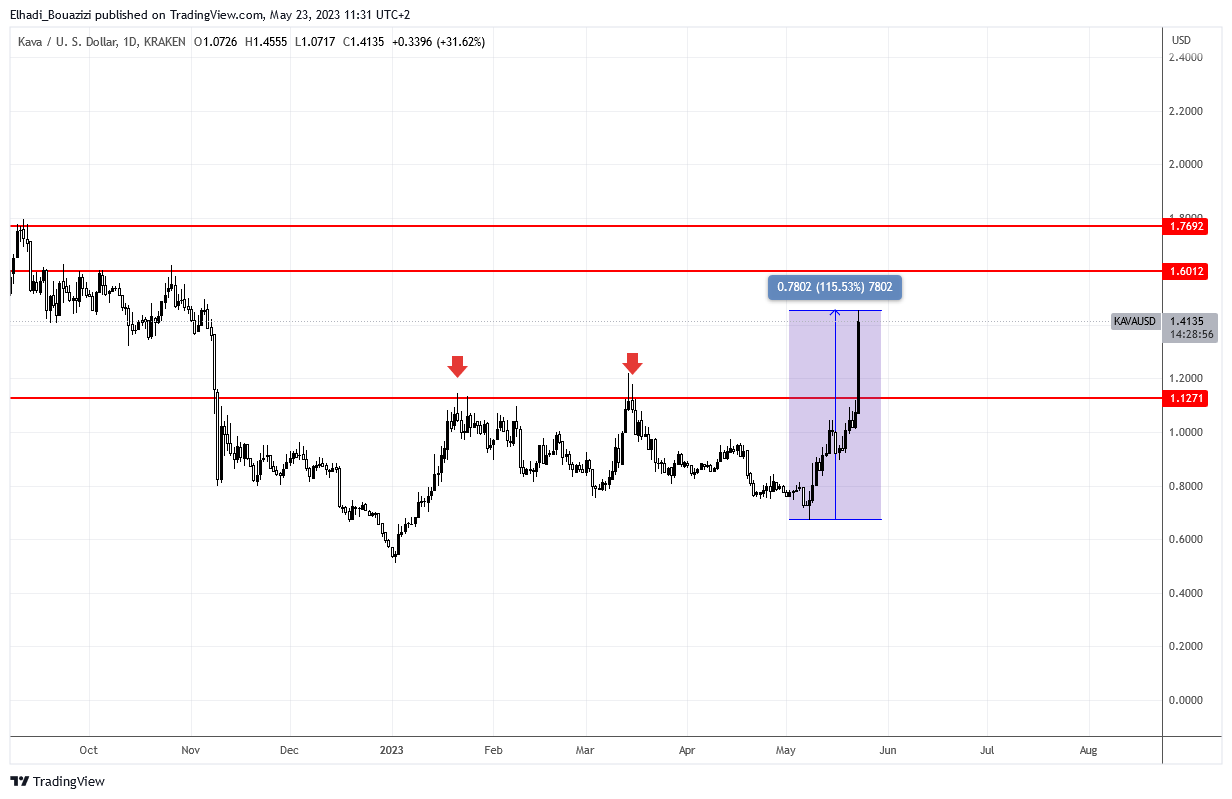 كما ارتفع، على الرسم البياني سعر عملة KAVA أكثر من 115% وبلغ ذروته عند 1.45 دولار صعودا من أدنى مستوياته التاريخية عند 0.672 دولا. (هذه الأرقام على منصة كراكن)