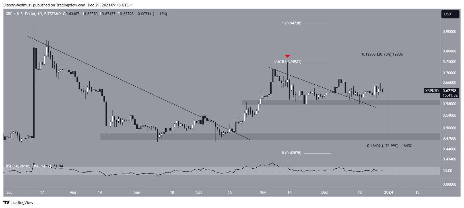 يظهر التحليل الفني للإطار الزمني الأسبوعي أن عملة XRP اتبعت خط دعم صاعد منذ مايو 2022.