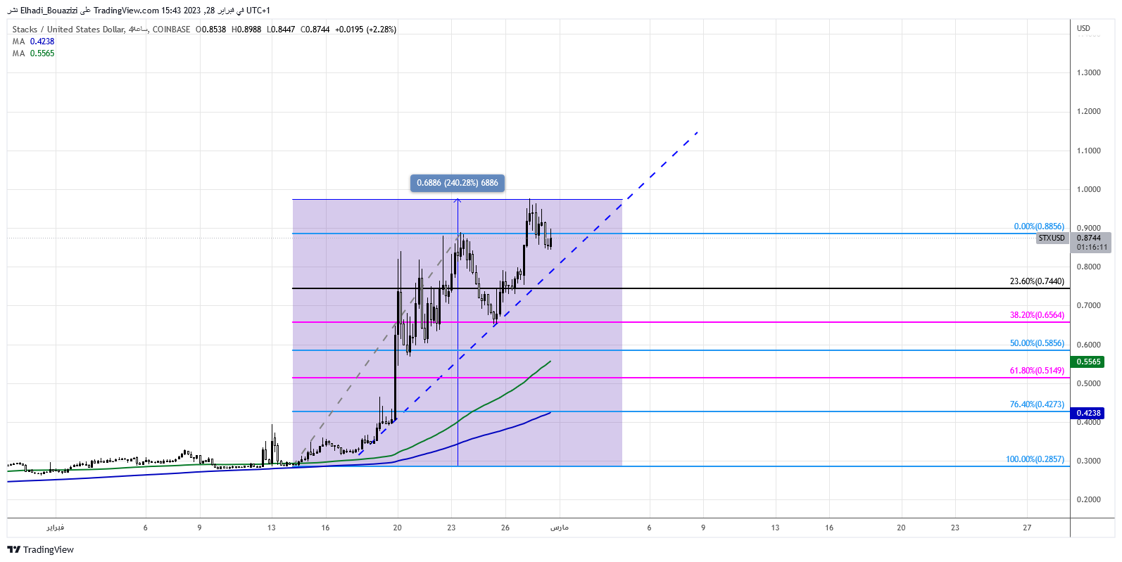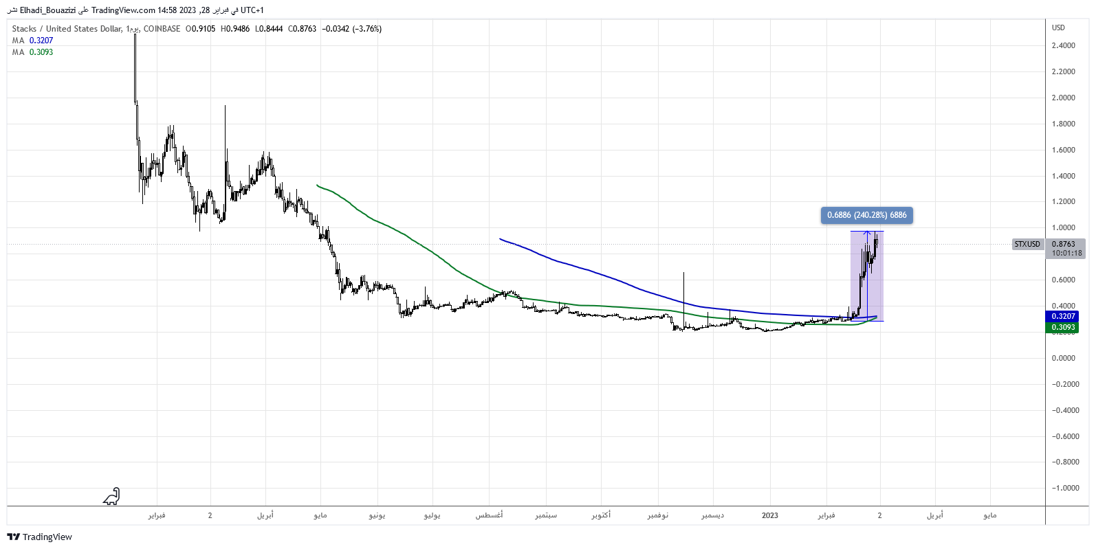 بالنظر إلى الرسم البياني اليومي لحركة سعر عملة Stacks (STX)، نلاحظ أنه منذ إدراجها للتداول في يناير عام 2022 بسعر 2.49 دولار و السعر في حالة تراجع حتى منتصف هذا شهر فبراير.