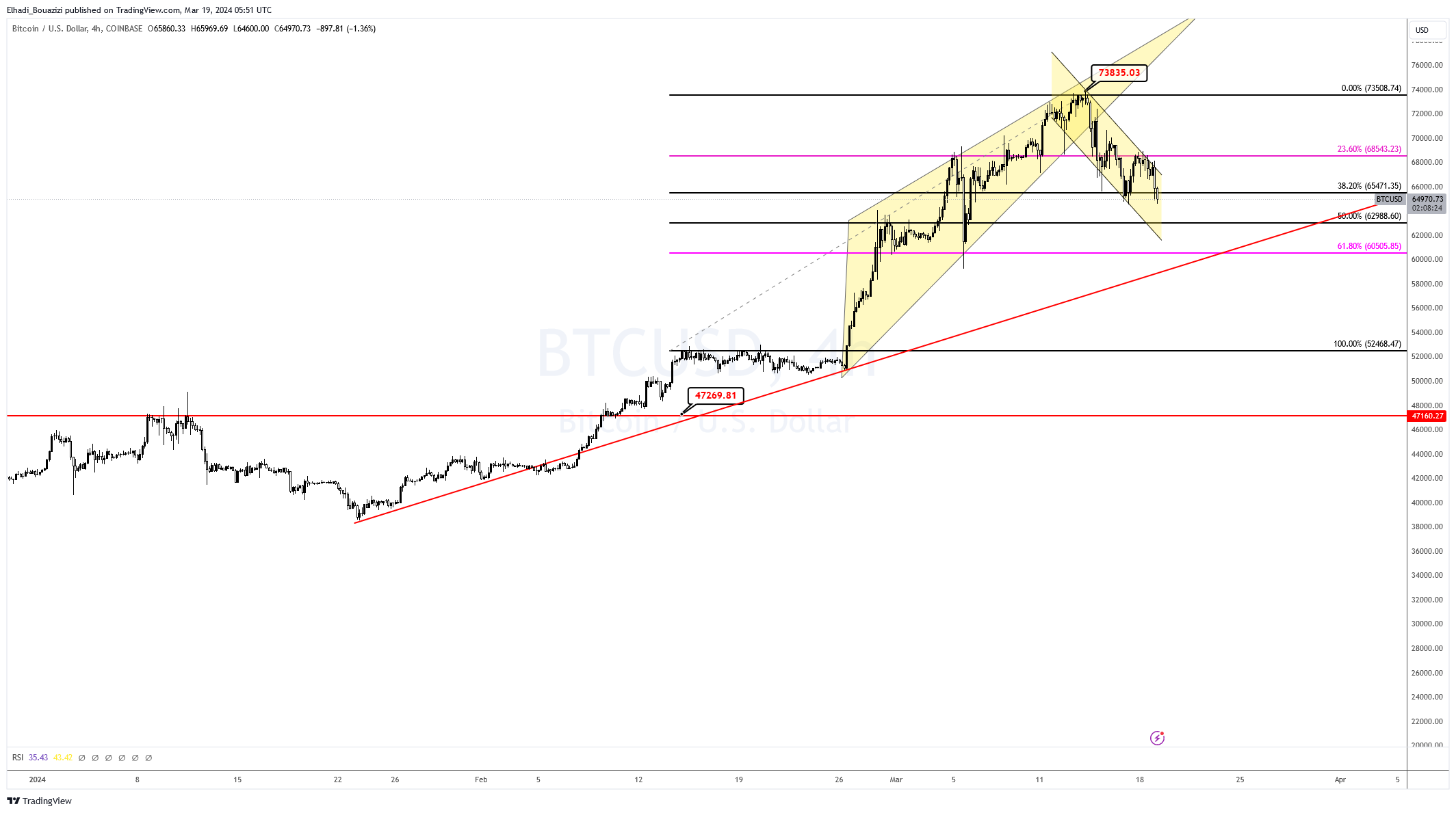 حسب الرسم البياني فإن أقوى مستويات الدعم موجودة في حدود 60,500 – 62,000 – 63,000 دولار. كما أن الحد السفلي للقناة السعرية يمثل مستوى جيد للشراء.