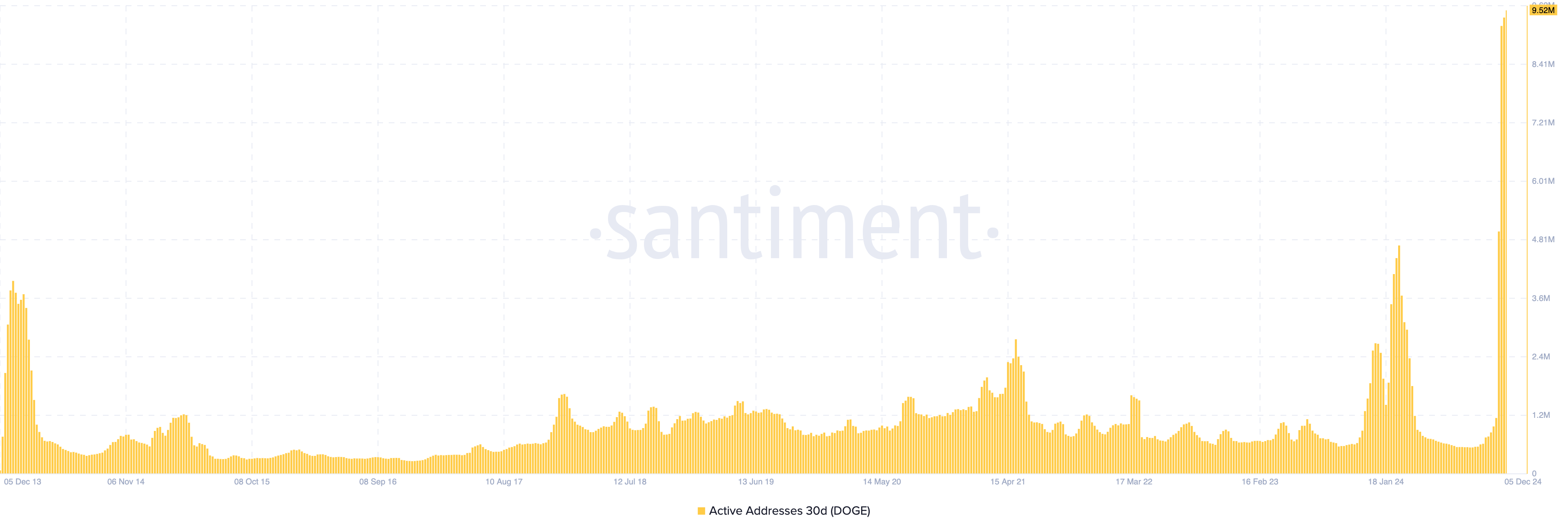 تظهر بيانات من Santiment أن العناوين النشطة لدوجكوين كانت أقل من 1 مليون في 31 أكتوبر. اعتبارًا من كتابة هذا التقرير، تغير ذلك وبلغت المقياس أعلى مستوى له على الإطلاق عند 9,52 مليون.